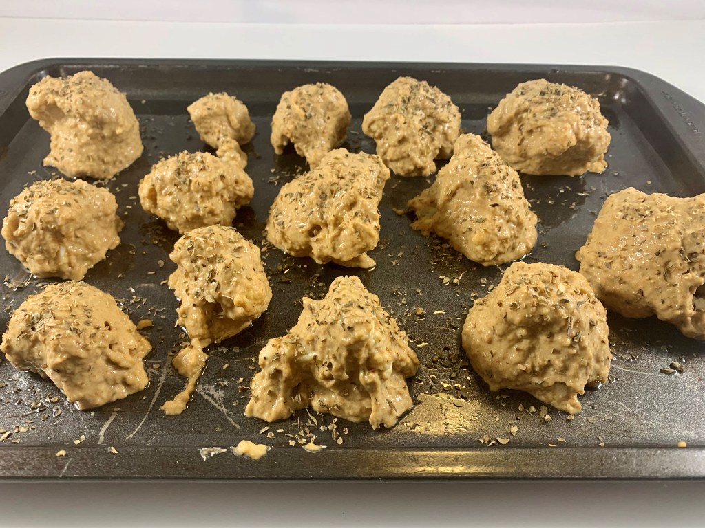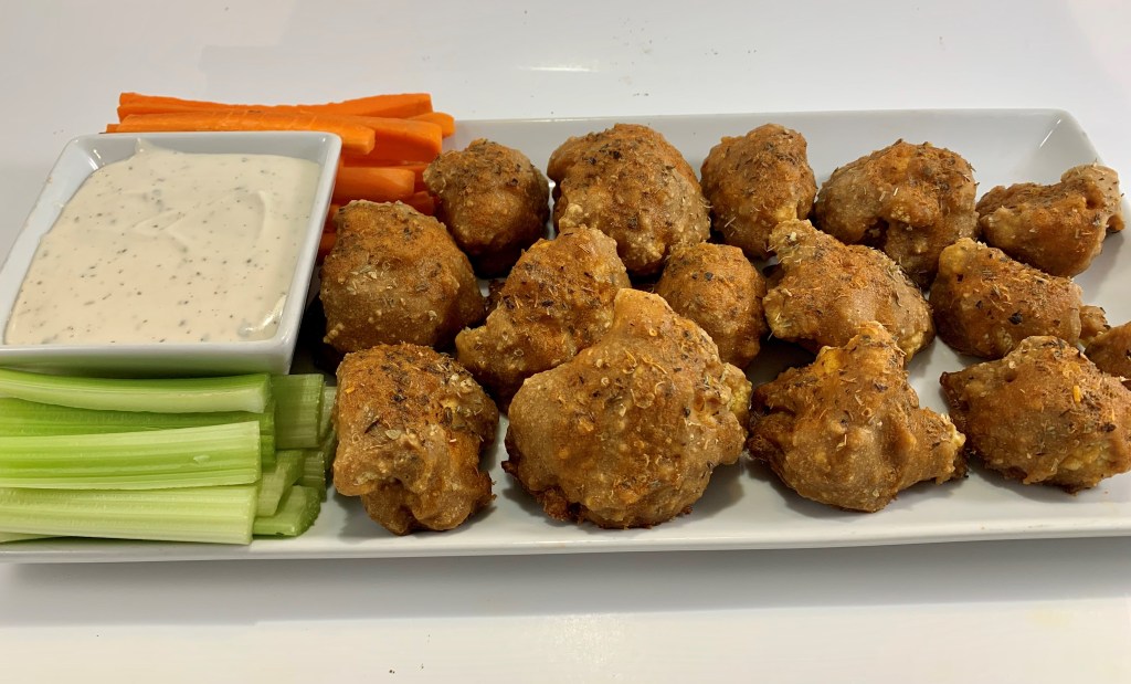 When they all look nice and crispy, take them out and serve them up with some plant-based ranch or bleu cheese, along with celery and carrot sticks.