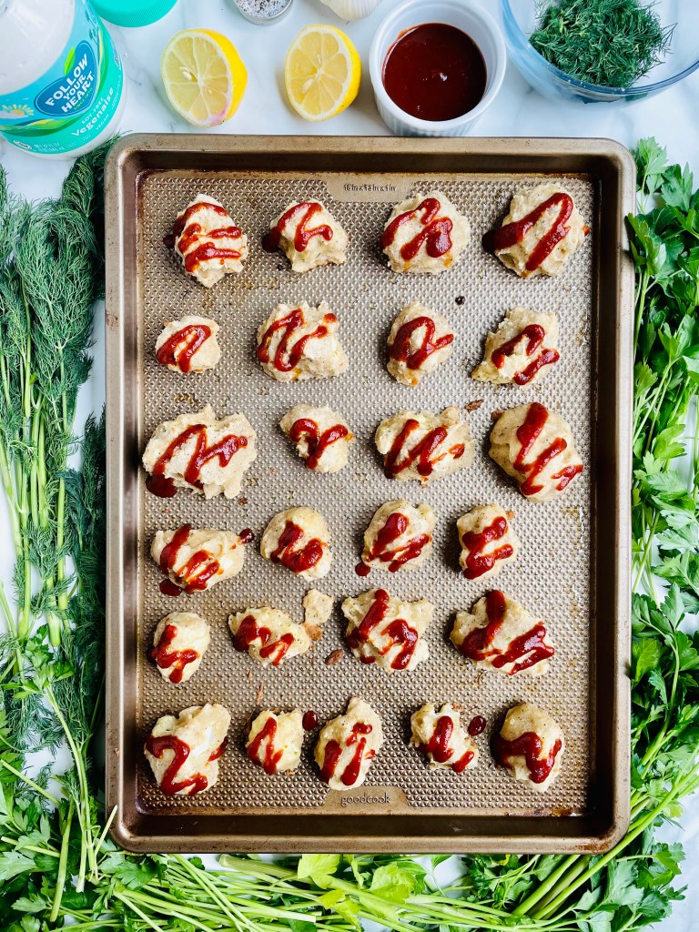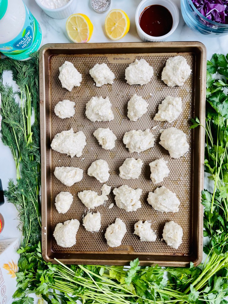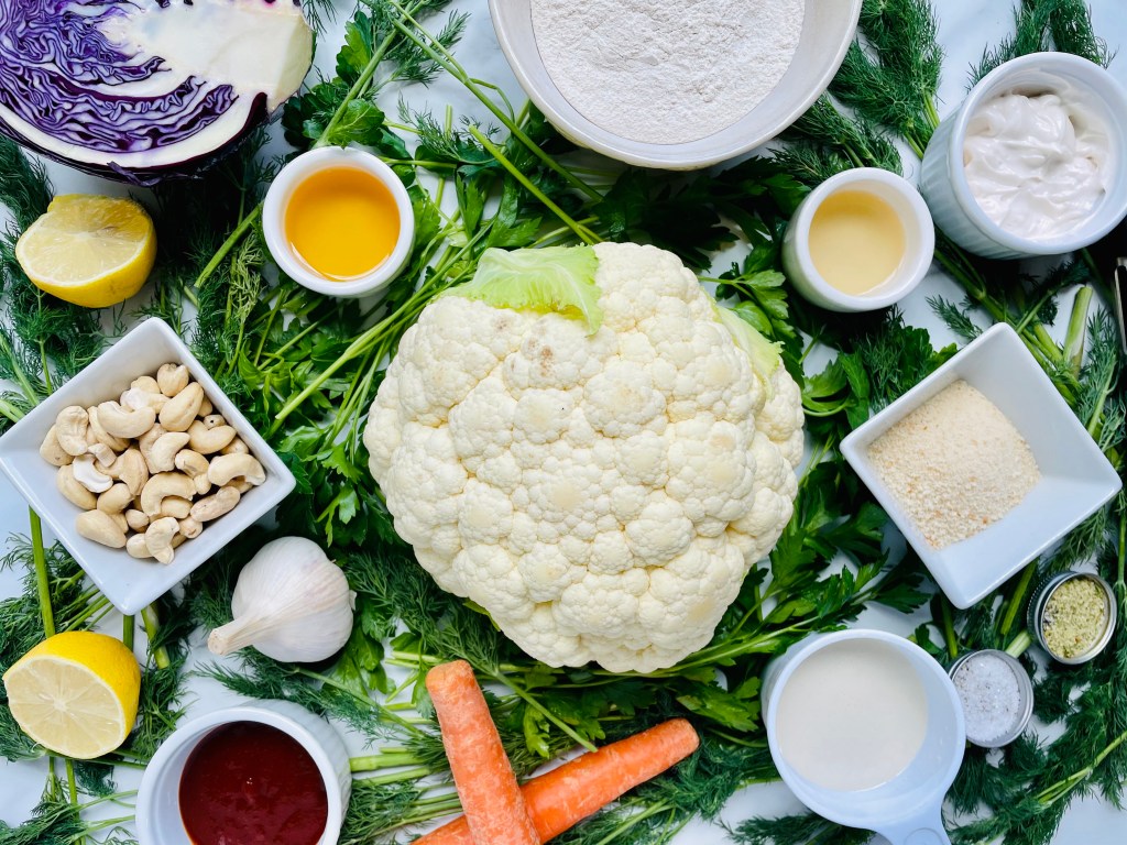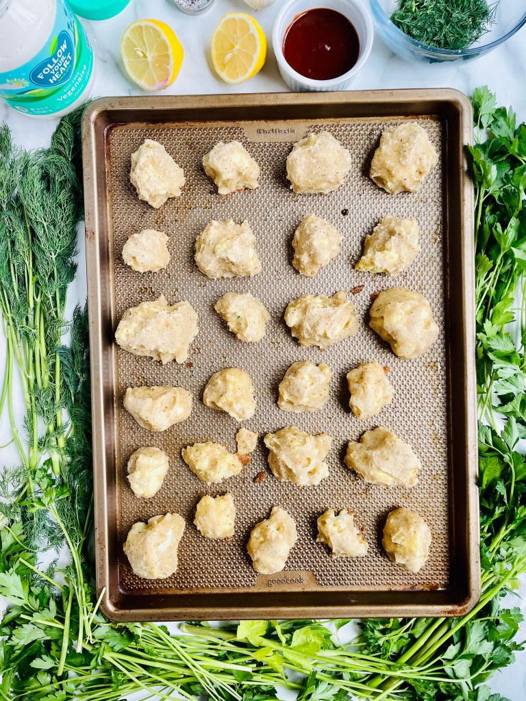 I breaded the cauliflower by whipping up a simple batter using only cassava flour, bread crumbs, onion powder, salt, pepper, oat milk, and avocado oil. After gently stirring, I dipped them in the batter and baked them at 450 degrees for 30 minutes on a lightly oiled baking sheet making them perfectly crispy and delicious.