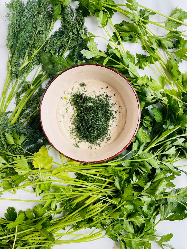 The cashew ranch was a first time for me, and aside from using a bit too much garlic, it has become a recipe that I will definitely be making more often – especially because it stays well in the refrigerator for up to 5 days and can be used as a great dip or topping for other meals. I made it by simply blending raw cashews that I boiled for 15 minutes, a few cloves of garlic, oat milk, lemon juice, apple cider vinegar, agave syrup, salt, and pepper. After fully blended, I stirred in a good bit of minced fresh dill weed that added the most beautiful flavor and aroma.