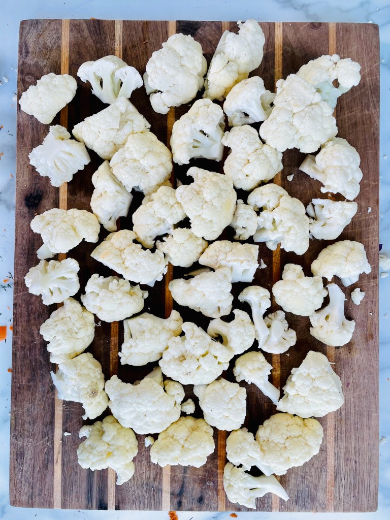 Chop the head of cauliflower in half, then break apart bite sized pieces. To make them smaller, simply chop them in quarters or cut parts of the stem off to get more of a nugget shape.