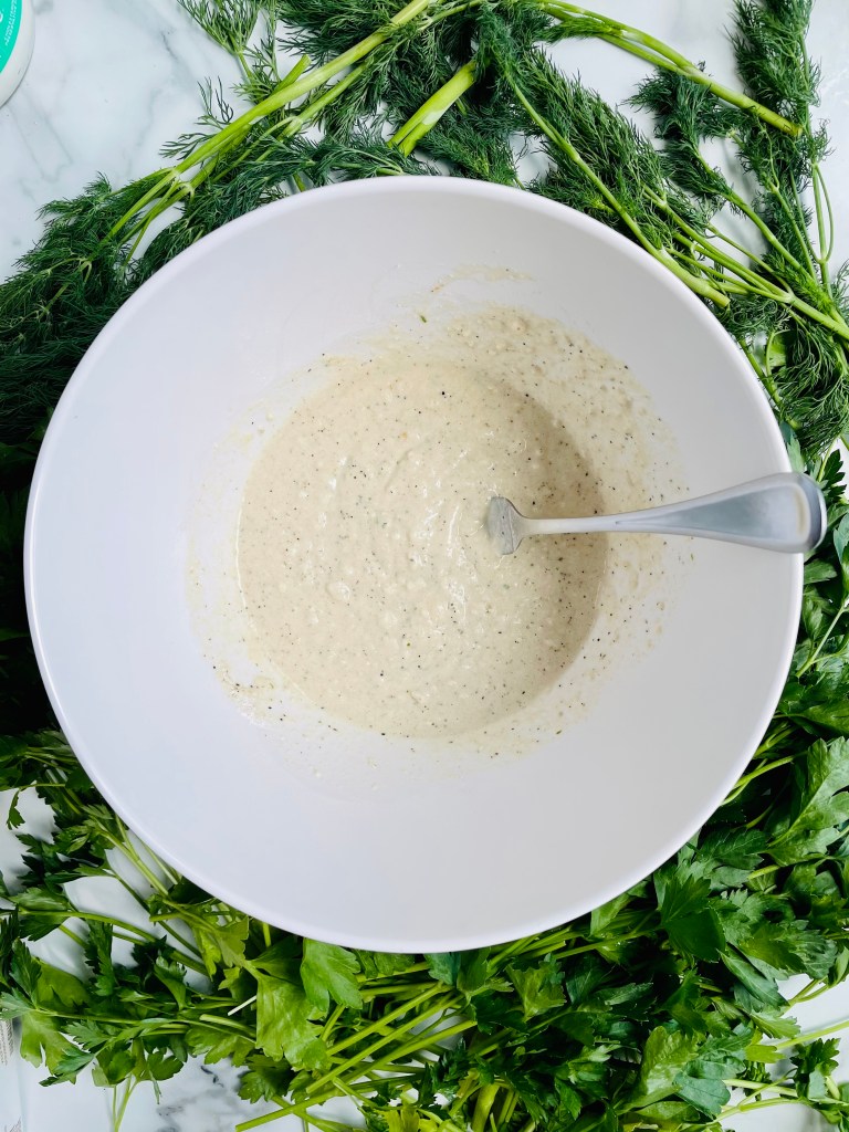 Blend together all ingredients aside from the fresh dill weed until you have a white and creamy mixture. If it is too thick, simply add in a bit more oat milk and dash of salt.