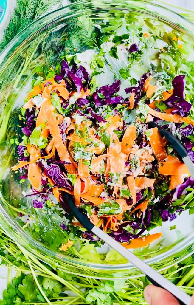 For the coleslaw, I did what I always do and chopped up some purple cabbage, shaved some carrots, and broke apart some fresh parsley to be stirred into vegan mayonnaise, salt, and pepper. Very simple ingredients, yet so refreshing, savory, and crunchy.