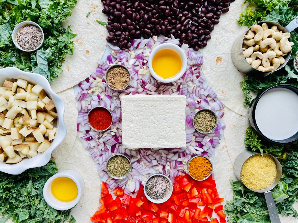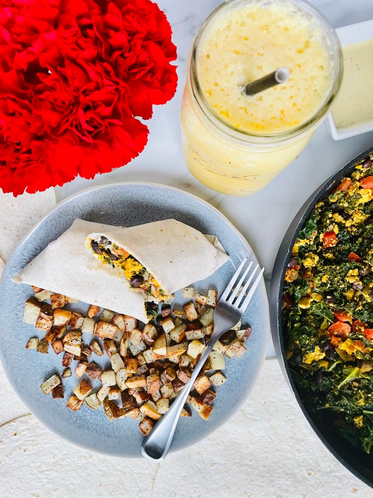 To plate, drizzle down the cashew sauce onto the flour tortillas, followed by the scramble, then the roasted potatoes and roll it all into a burrito form to the best of your ability.