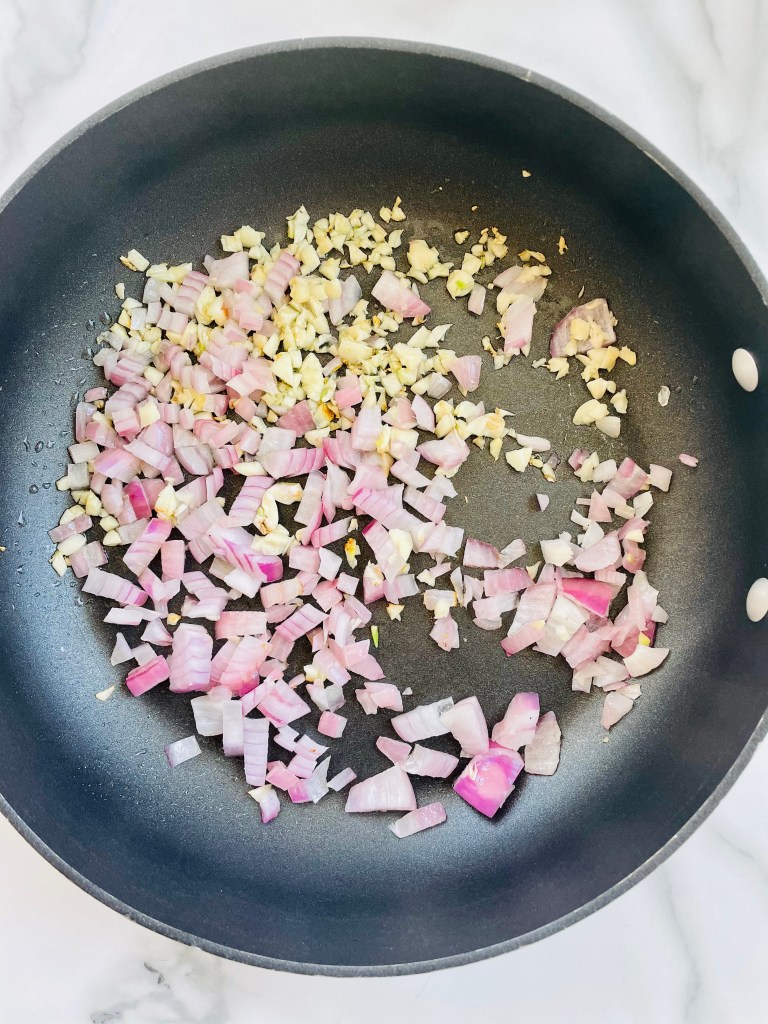 After the pan has heated up for at least 5 minutes and you’ve already minced your garlic and red onion, drop them down and allow them to sauté until the onion becomes a bit translucent.