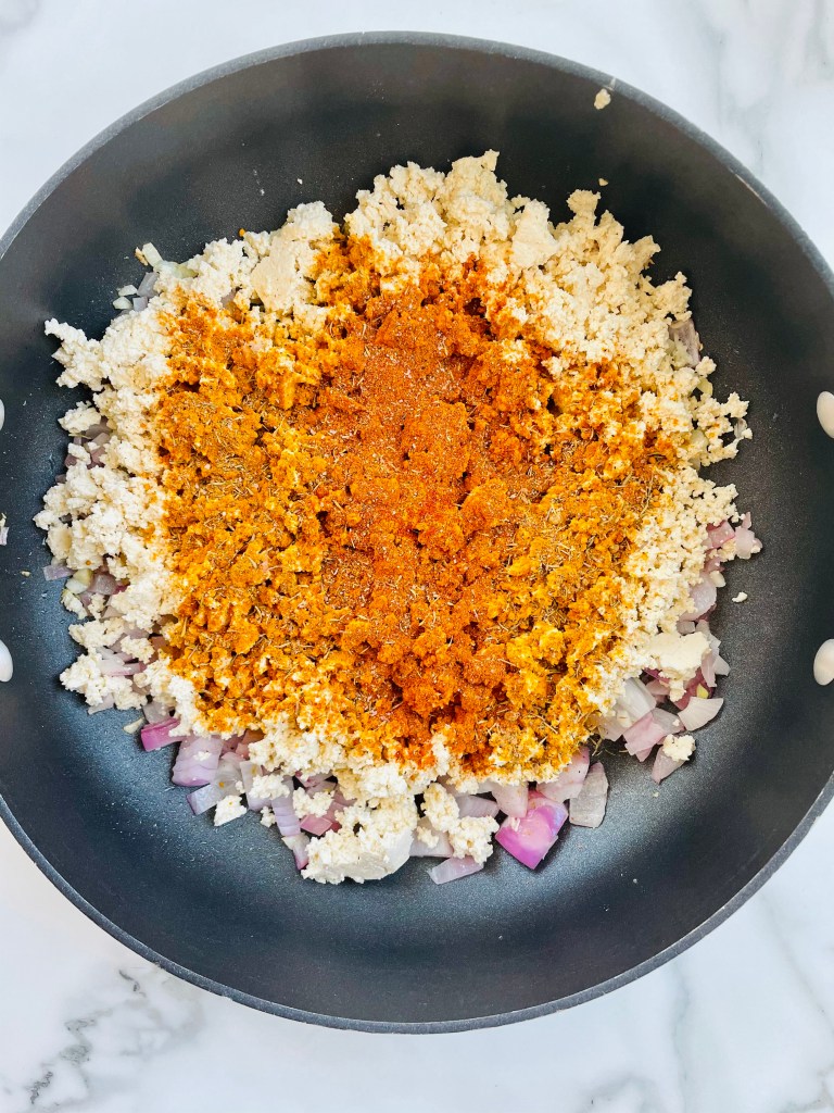 Drain the water out of your tofu with a clean rag or some paper towels, then scramble the tofu into the sauteed mixture.
