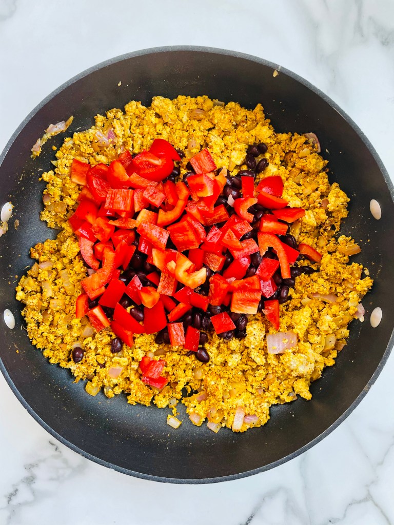After around 5 minutes, dice the red bell pepper, strain and rinse your black beans, then drop them into the pan.