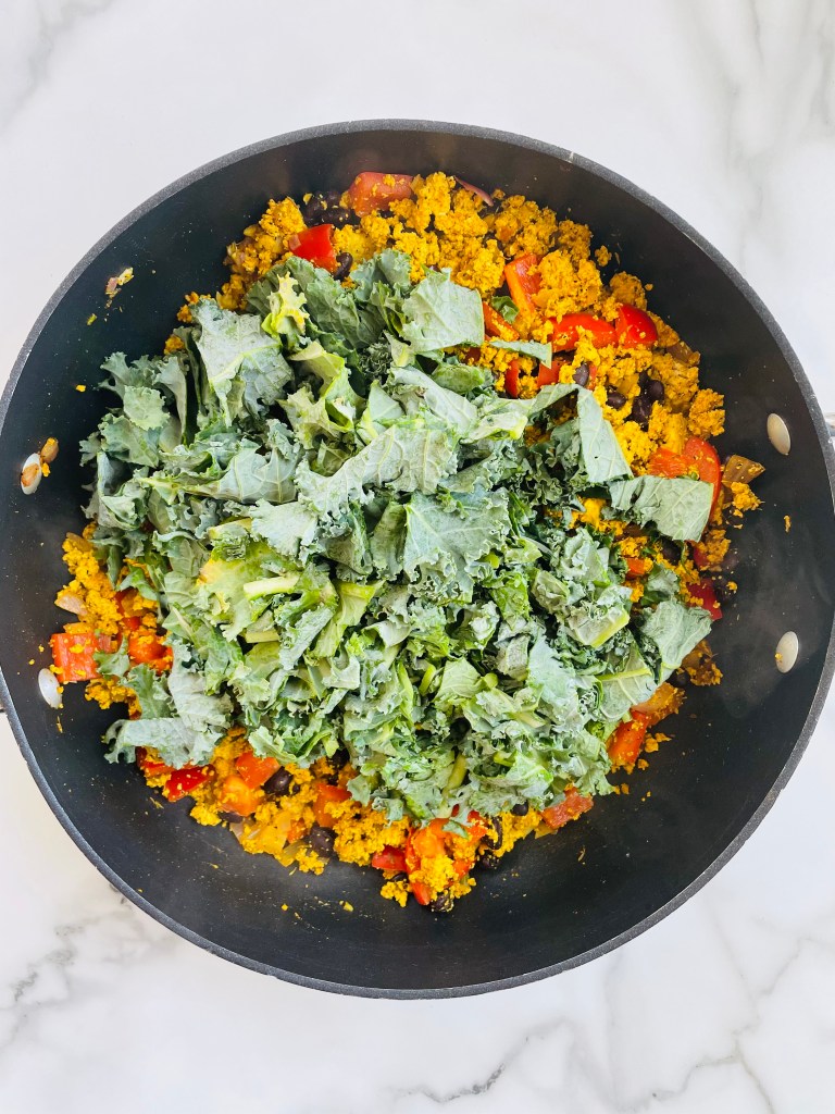 Starting off by whipping up my famous tofu scramble recipe, I was on the road to success from the get go. The scramble consists of sautéed garlic, red onion, extra firm tofu, red bell pepper, black beans, and kale to be simmered and seasoned with salt, pepper, coriander, paprika, turmeric, dried oregano, and dried thyme.