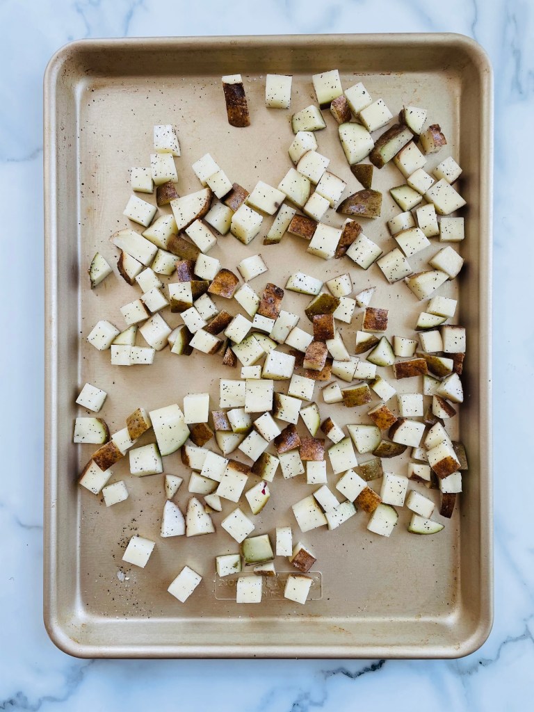 Dice the potatoes, lay them on a baking sheet, drop down the avocado oil, salt, and pepper, then get your hands dirty and give em a good mix.