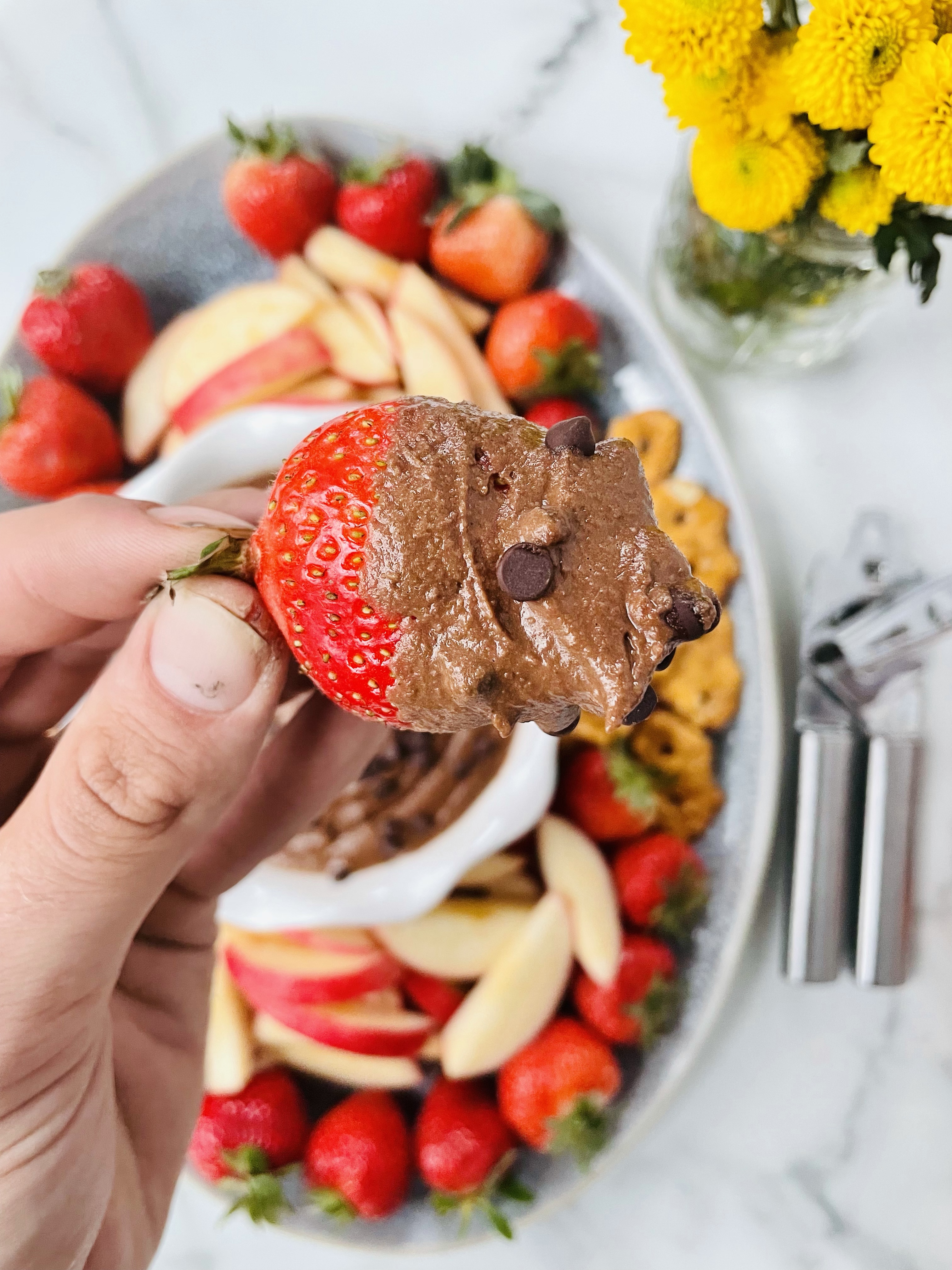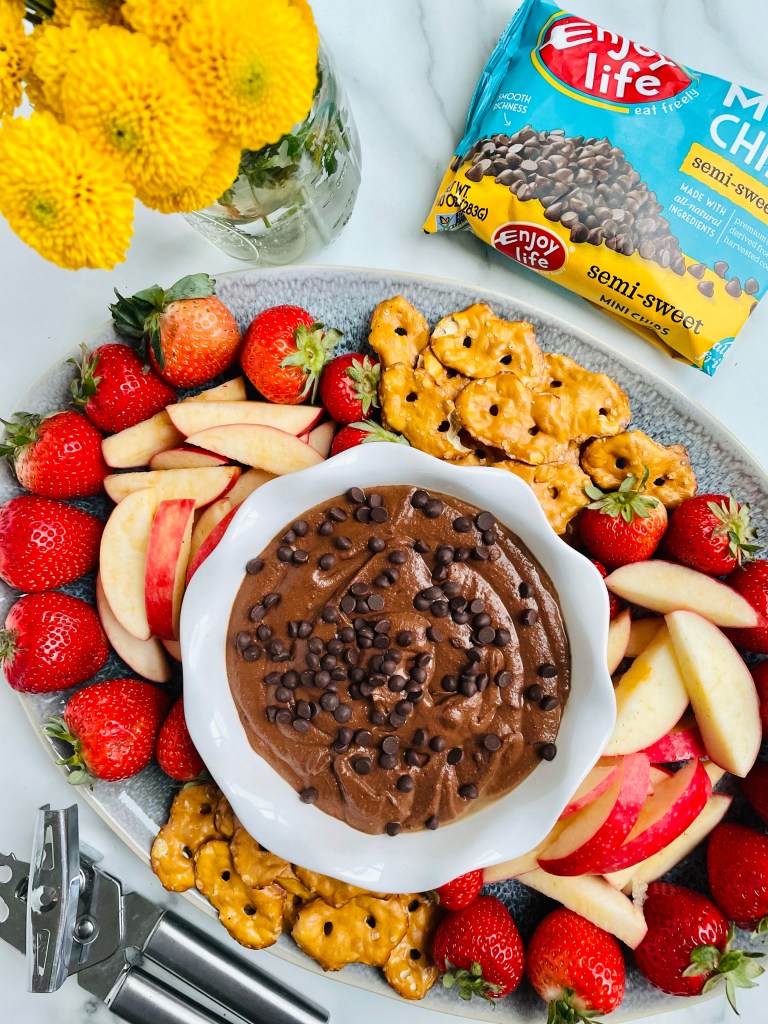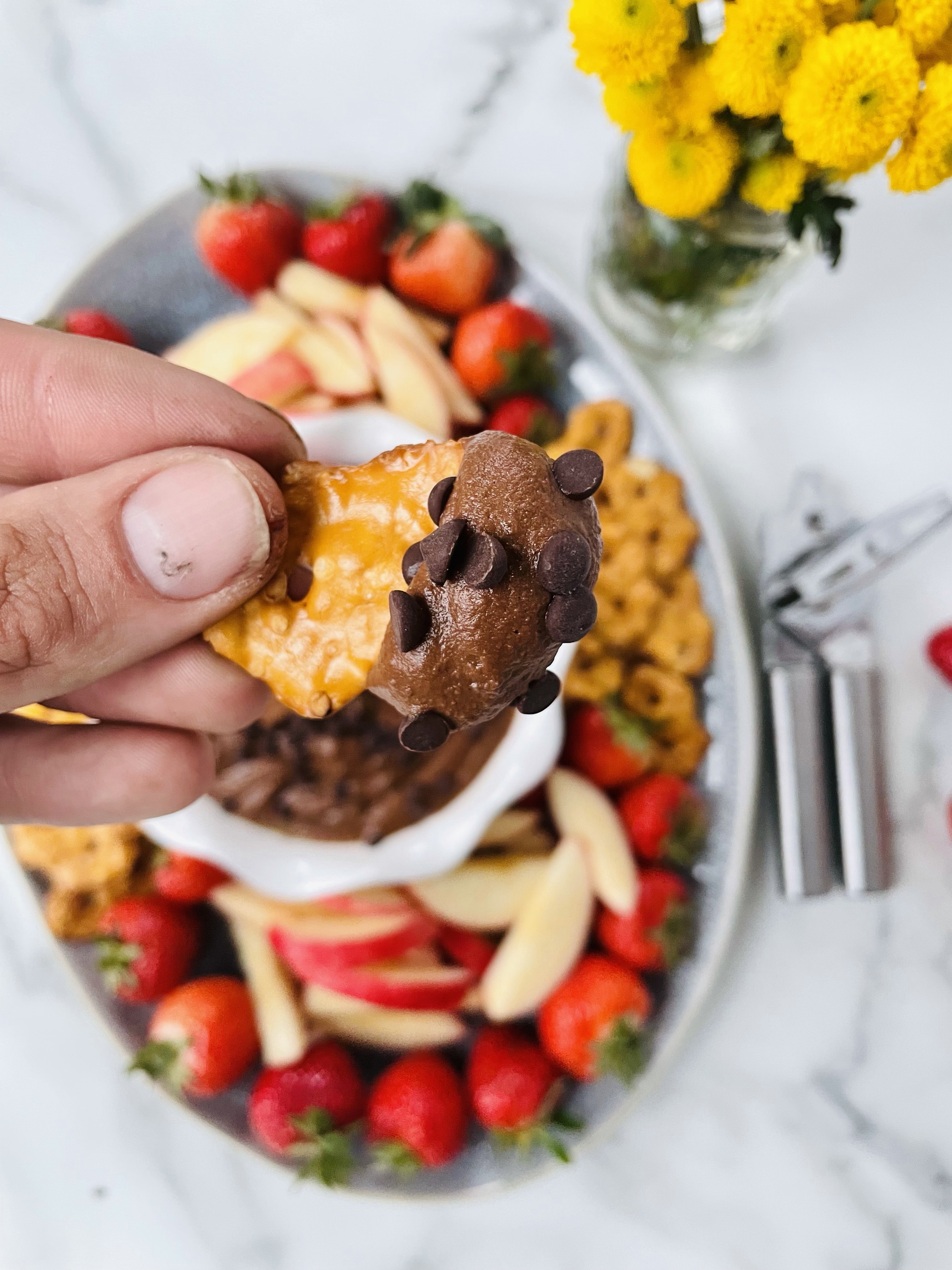 My brownie batter hummus platter features a dessert hummus blended right at home with chickpeas, coconut sugar, oat milk, cacao powder, almond butter, dairy-free chocolate chips, and a pinch of salt until perfectly creamy that makes for the most delicious dip for all of your favorite snacks.