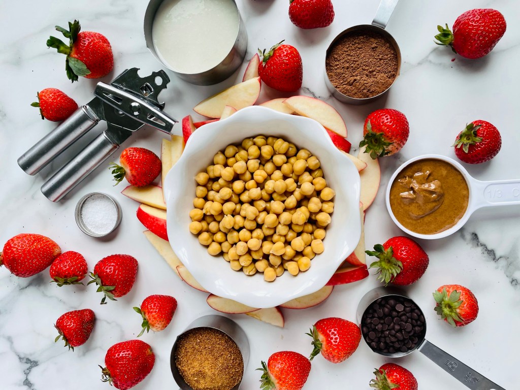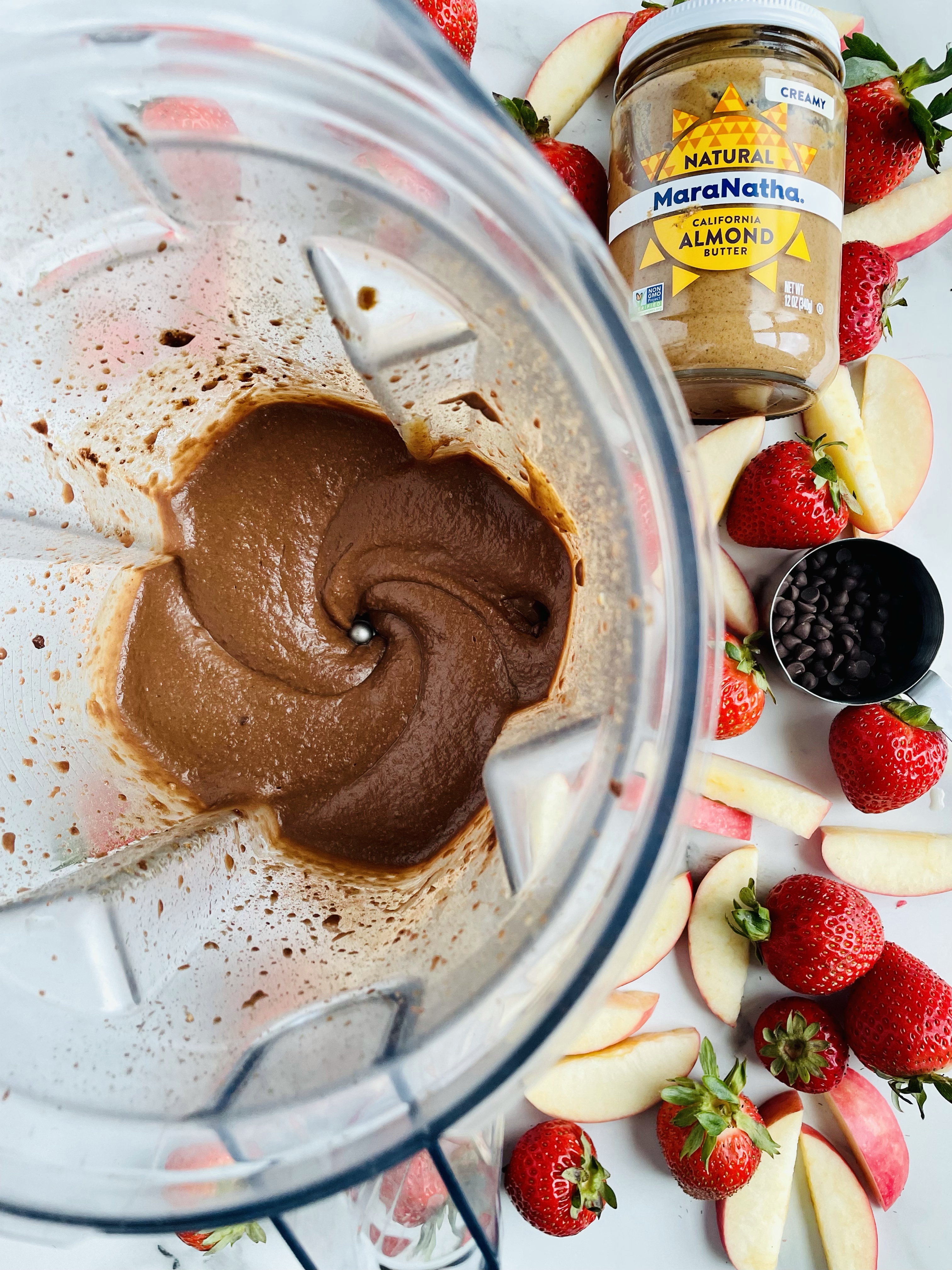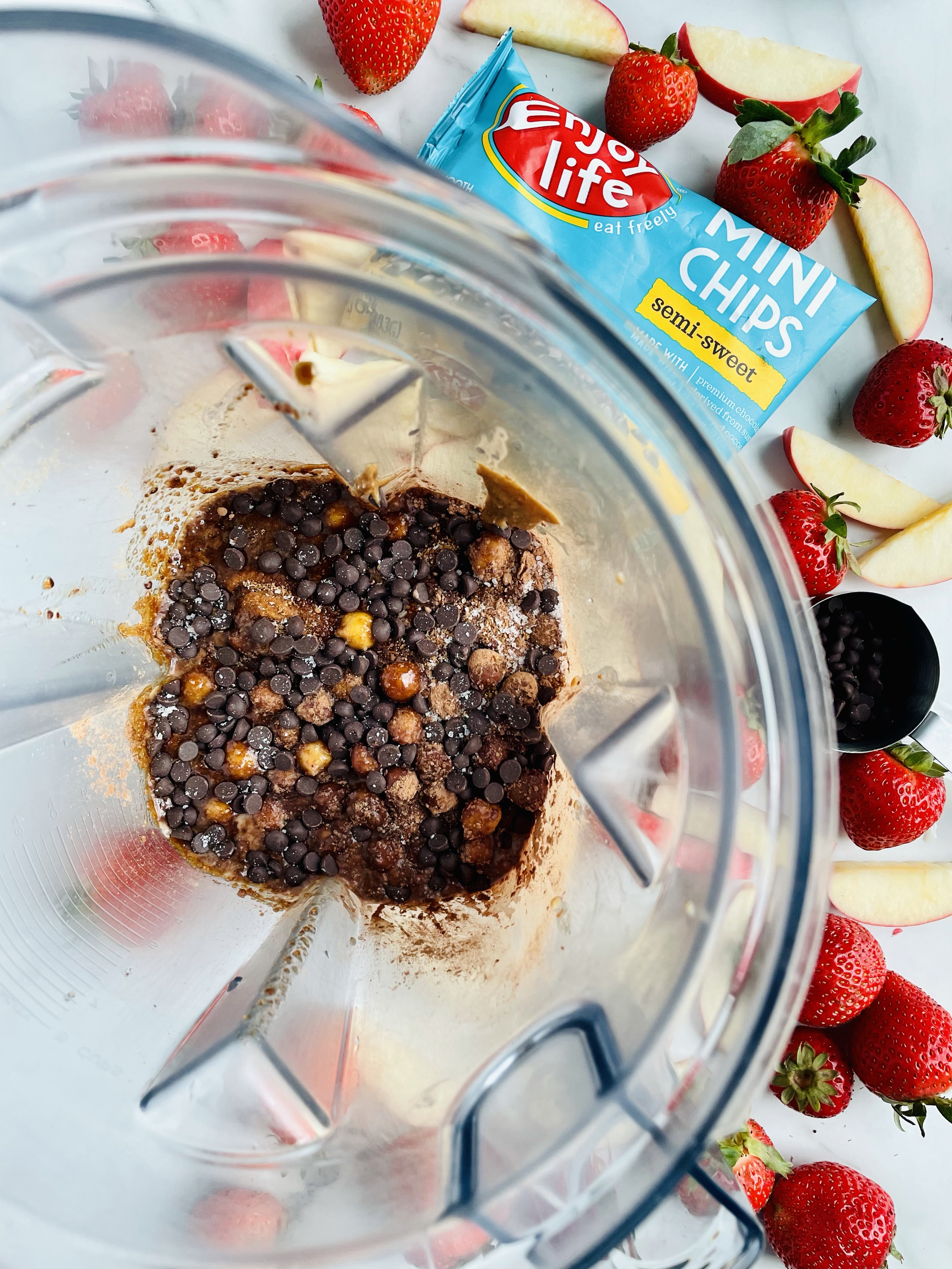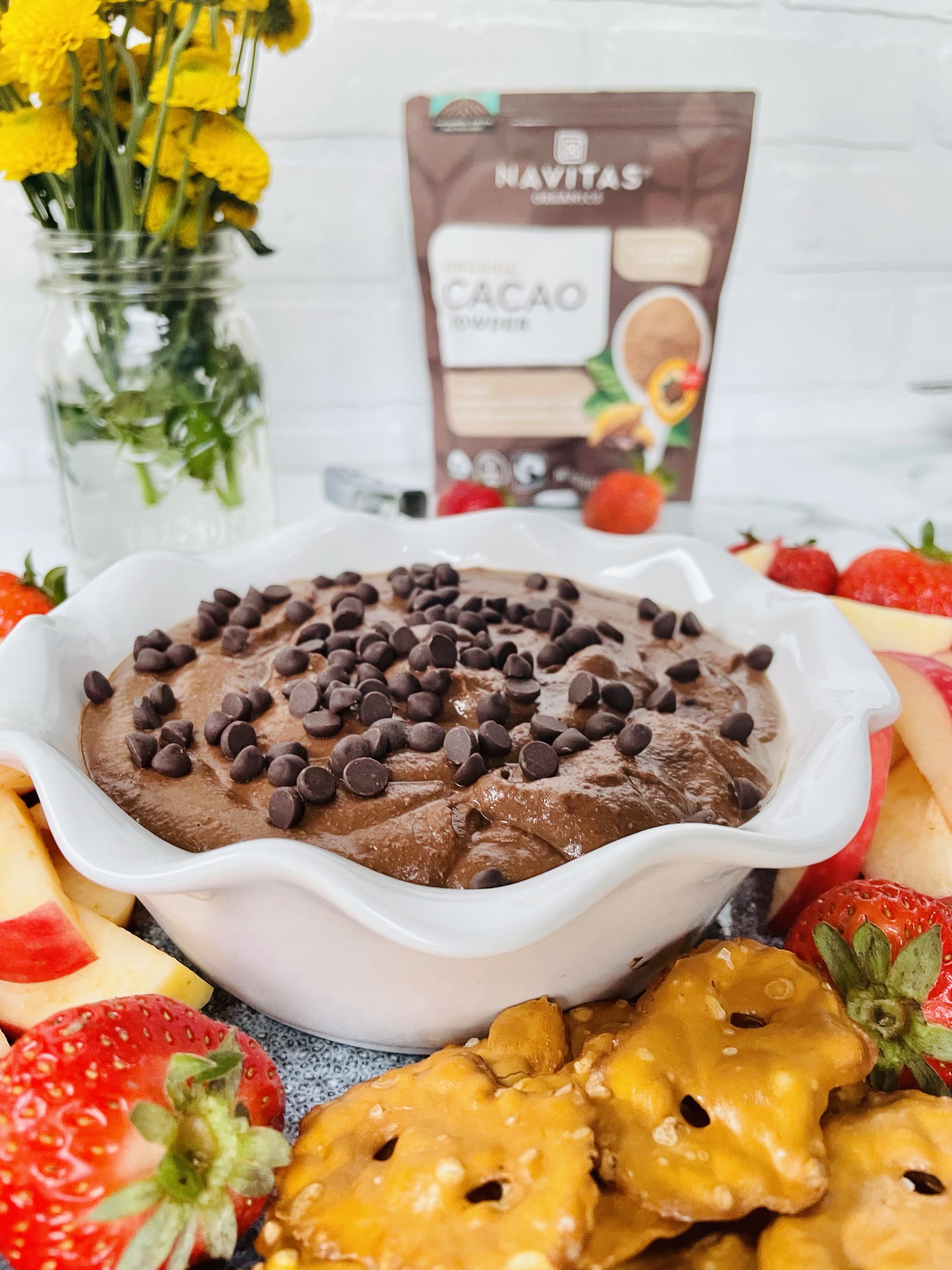 My brownie batter hummus platter features a dessert hummus blended right at home with chickpeas, coconut sugar, oat milk, cacao powder, almond butter, dairy-free chocolate chips, and a pinch of salt until perfectly creamy that makes for the most delicious dip for all of your favorite snacks.