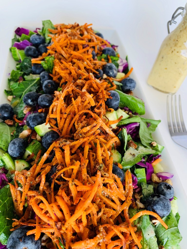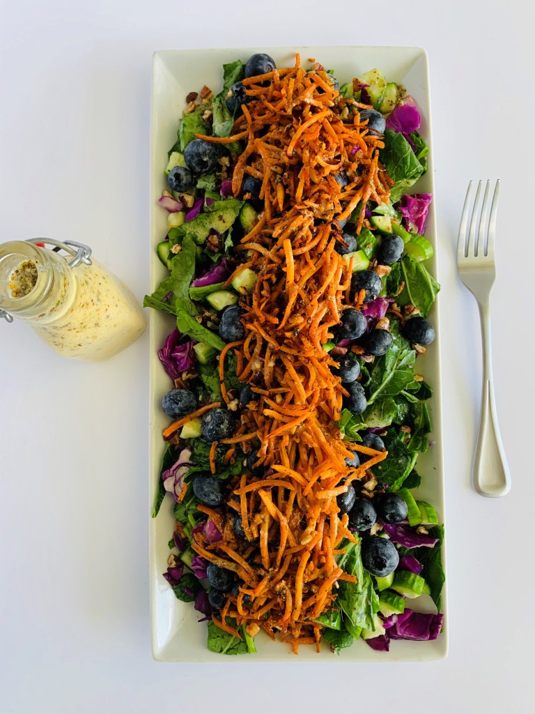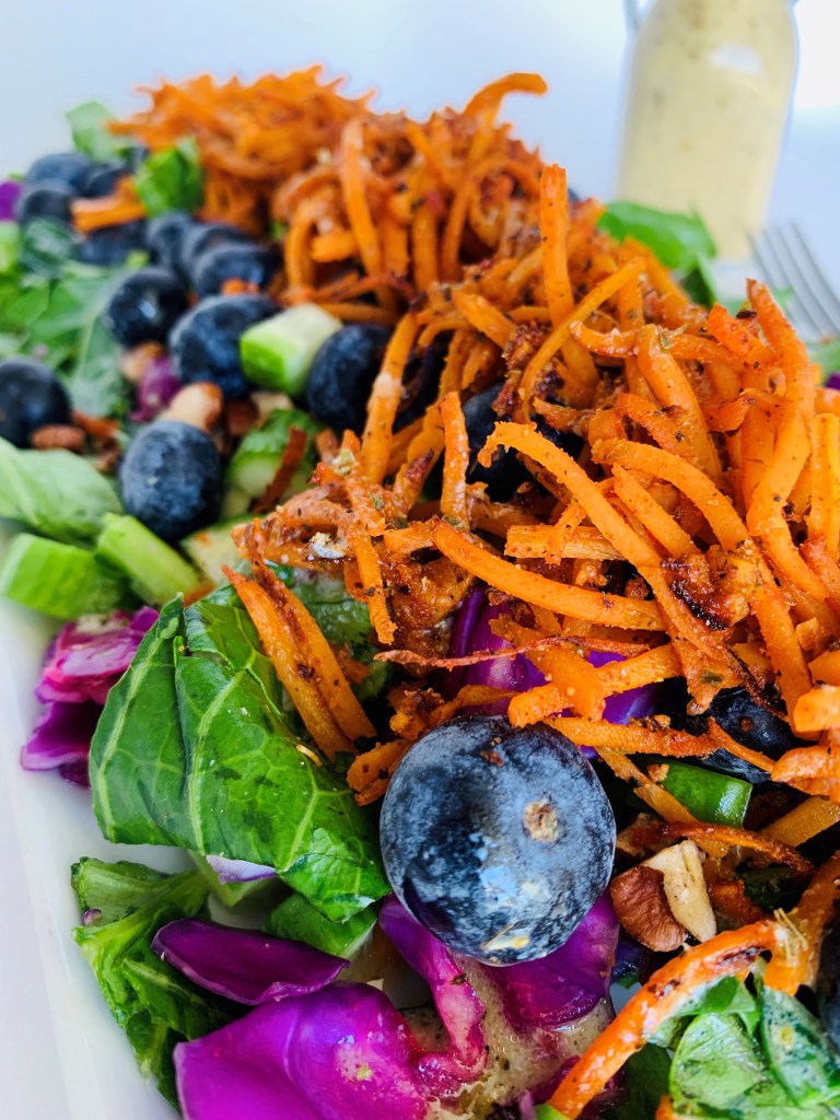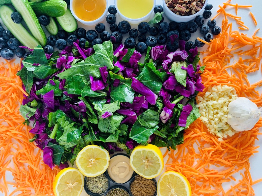 Featuring some red cabbage, collard greens, persian cucumbers, seasoned shredded carrots, a bit of fresh North Carolina blueberries, and crushed pecans all topped with a tasty and homemade lemon pepper vinaigrette – it was a huge hit when surprising a loved one for a date night dinner at the apartment recently.
