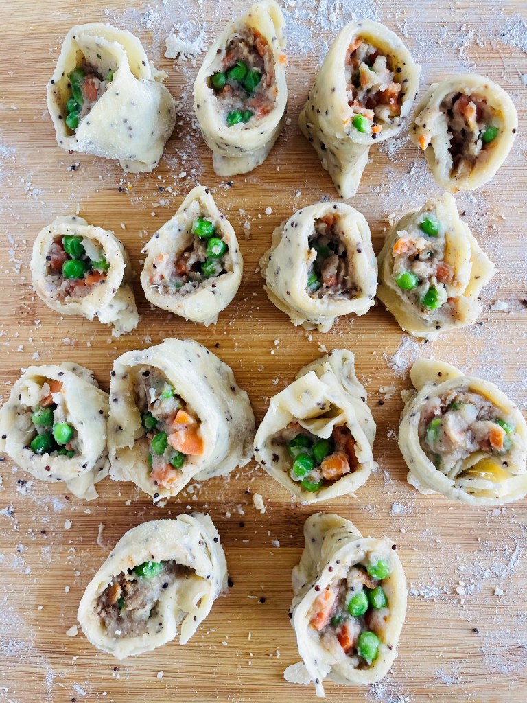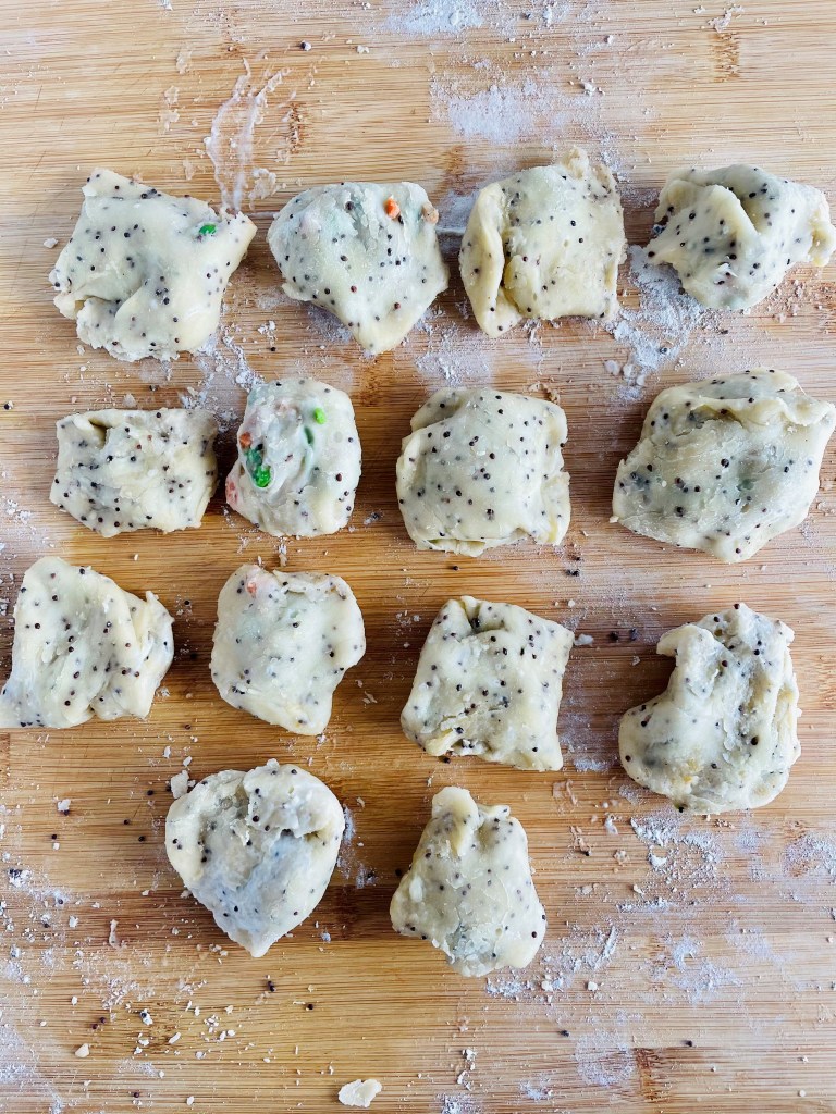 Take a teaspoon or less of your potato filling and drop it into the open hole of the dough, and finally seal it up on the other side using the same method with the water(it is okay if it doesn’t look too pretty, just do your best to fully seal it).