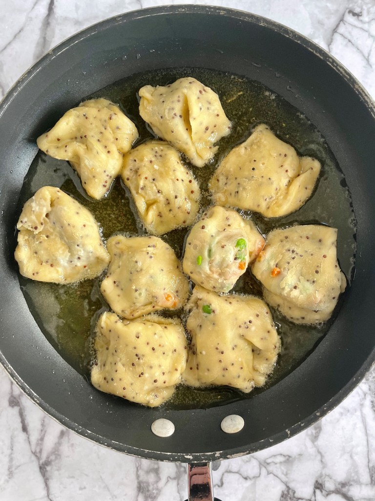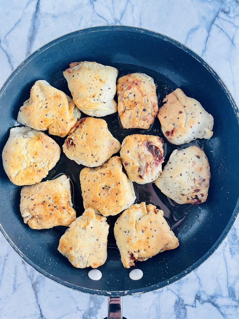 I decided to fry mine in some additional avocado oil on the stovetop, and they turned out great. They could also be just fine being popped in the oven or air fryer at 400 degrees for 15 minutes or until you see the dough turn slightly brown.