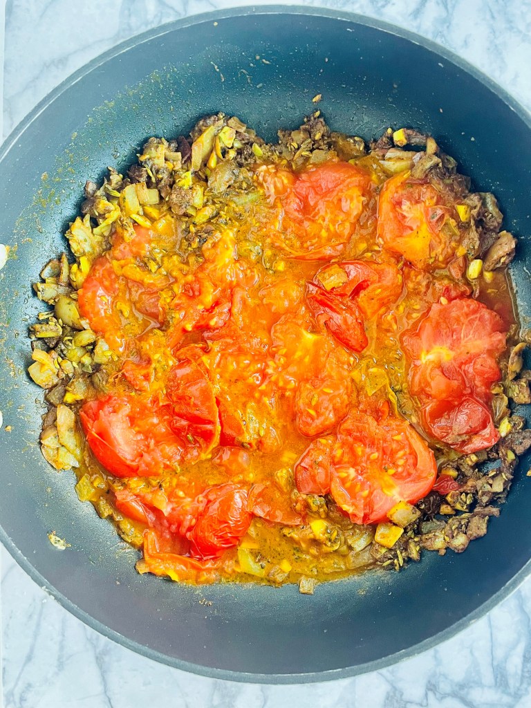 Chop the tomatoes in half and add them into the saucepan – cover the mixture for a few minutes, giving it a good stir occasionally.