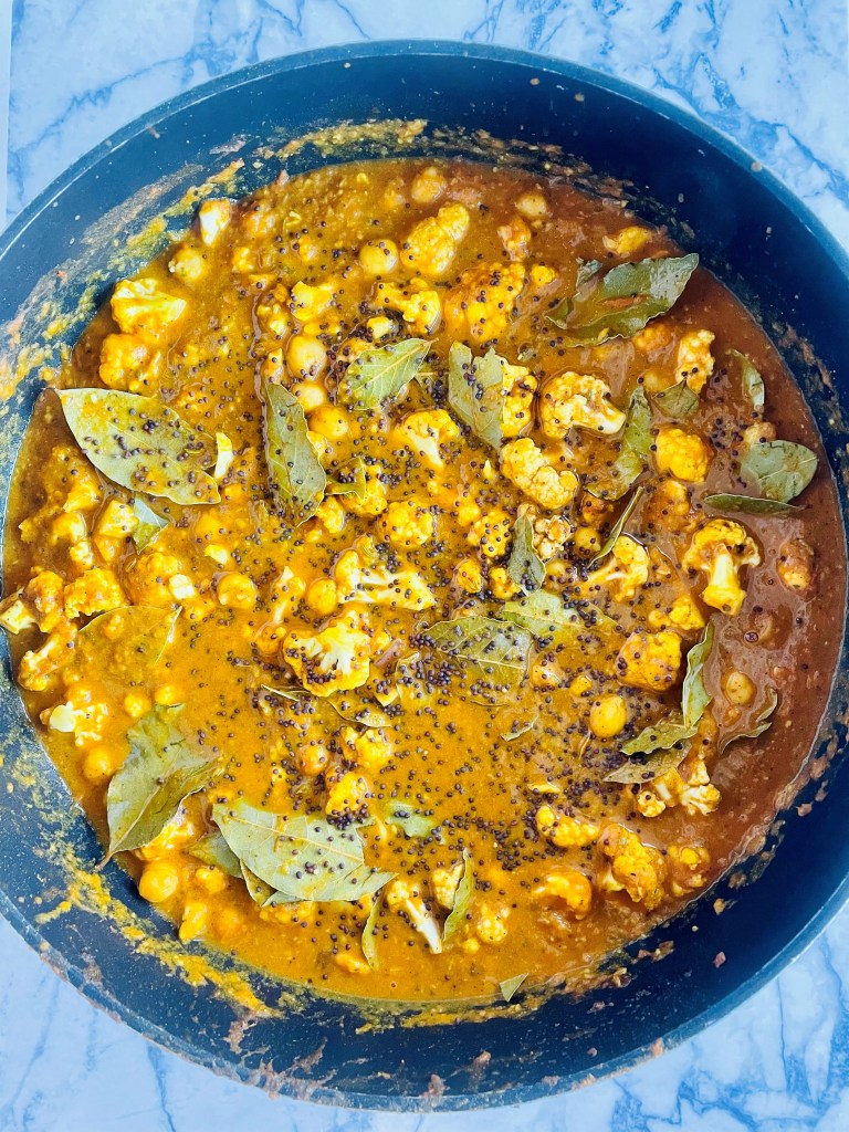 After you chop and break apart small pieces of your half head of cauliflower, drop them into the gravy as well as your strained can of chickpeas.