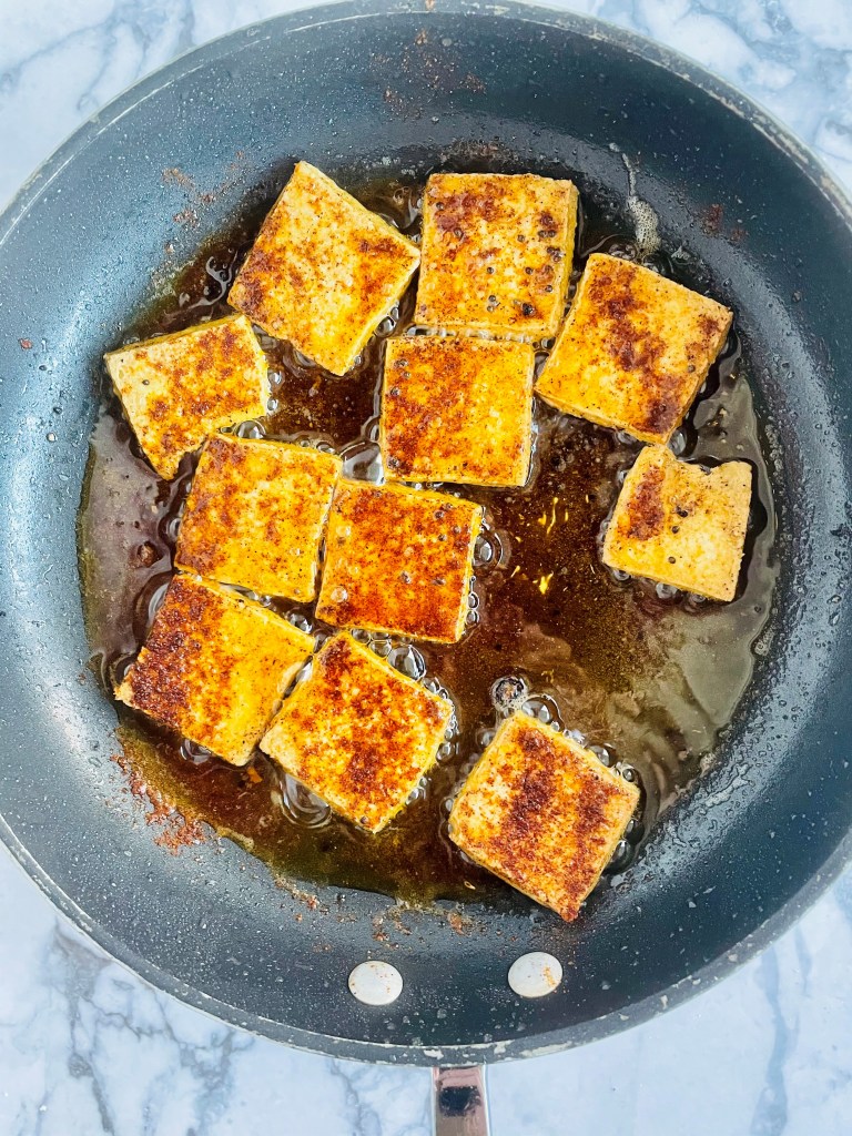 If you decide to get crazy and add in the sliced tofu, simply drain the water out of the tofu and slice 12 thin pieces of the tofu and fry them on an additional saucepan with avocado oil, salt, and paprika. Allow the pieces to fry on each side until you see the edges turn crispy.