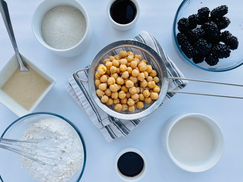 Chickpeas are a staple ingredient in this recipe, but I also tossed in a bit of cassava flour, organic cane sugar, egg replacement(from Bobs Red Mill), vanilla extract, agave nectar, baking powder, and a pinch of salt blended in a food processor with oat milk to create the perfect batter ready to be baked and beautiful in just 30 minutes.