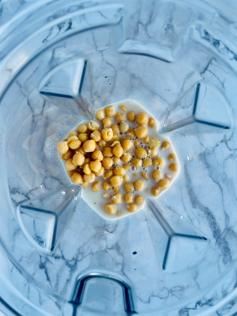 Start off by adding the 15 oz of chickpeas, vanilla extract, agave nectar, and oat milk to a high speed blender or food processor, then pulse until your mixture is super creamy and pourable and set aside(add more milk if it is too thick).