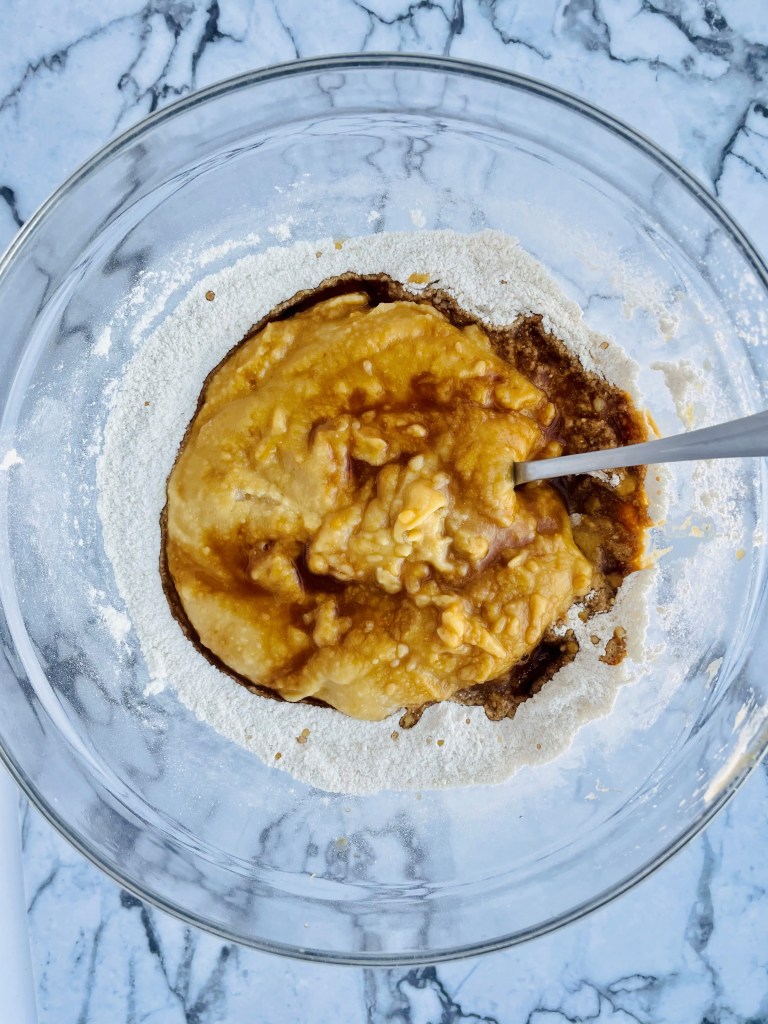 Create the egg replacement with a few tablespoons of water or as directed on the Bobs Red Mills package, if you are using ground flaxseed, simply stir it around with at least 1/4 cup of water until it becomes thick, then add it into your large mixing bowl.