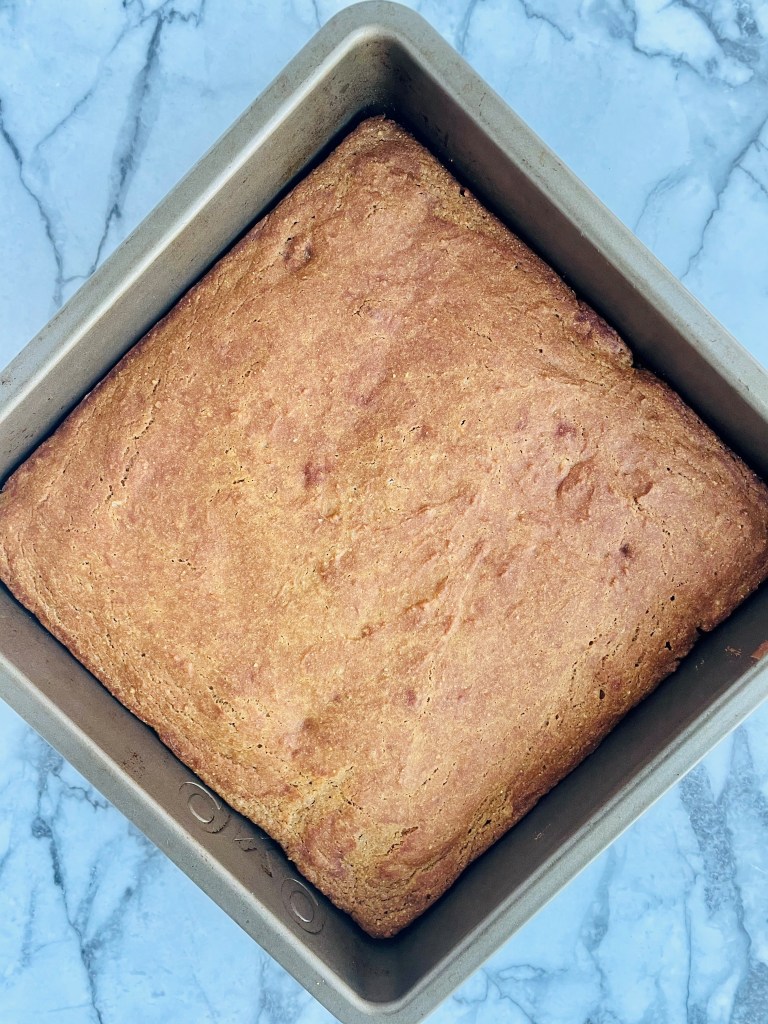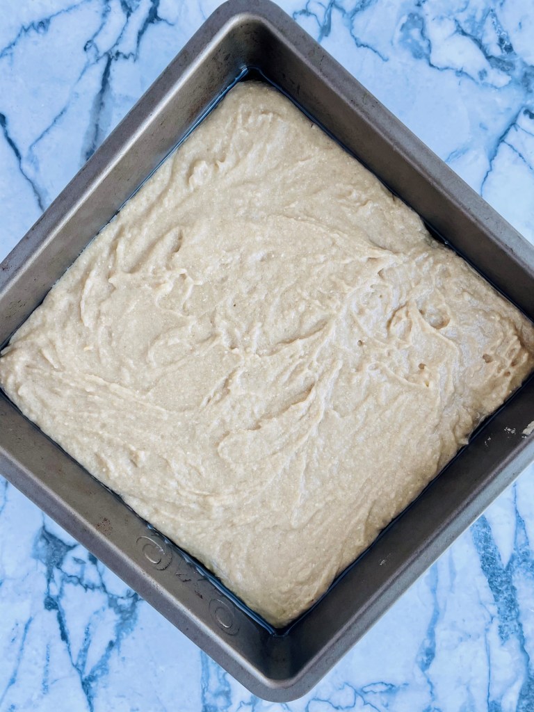 After you have spread the batter to be flat and even, pop that guy in the oven and bake for 30 minutes or until you see the top turn golden-brown(see pictures above).