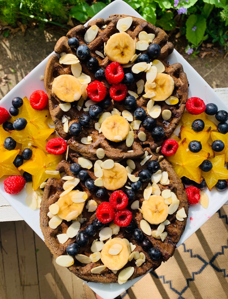 Finally, plate it up and dazzle all of your fruits and almonds onto the waffles, perhaps even a few drizzles of maple syrup or more of the agave nectar, and be prepared for the waffle breakfast of a lifetime!