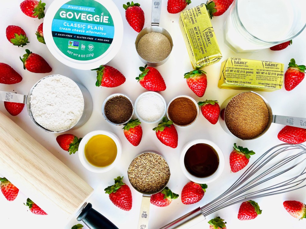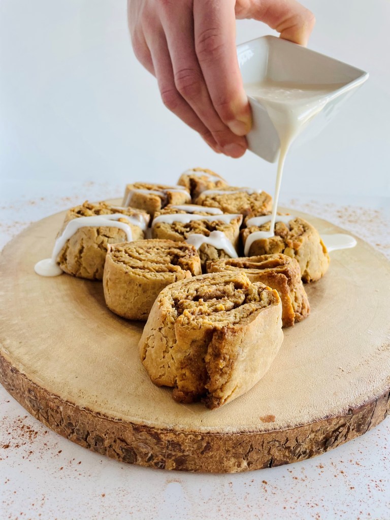 As for the cream cheese glaze frosting, I used a brand called Kite Hill, that has the best plant based cream cheese on the market, agave syrup, and a small amount of oat milk to thin out the creaminess.