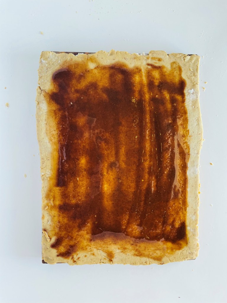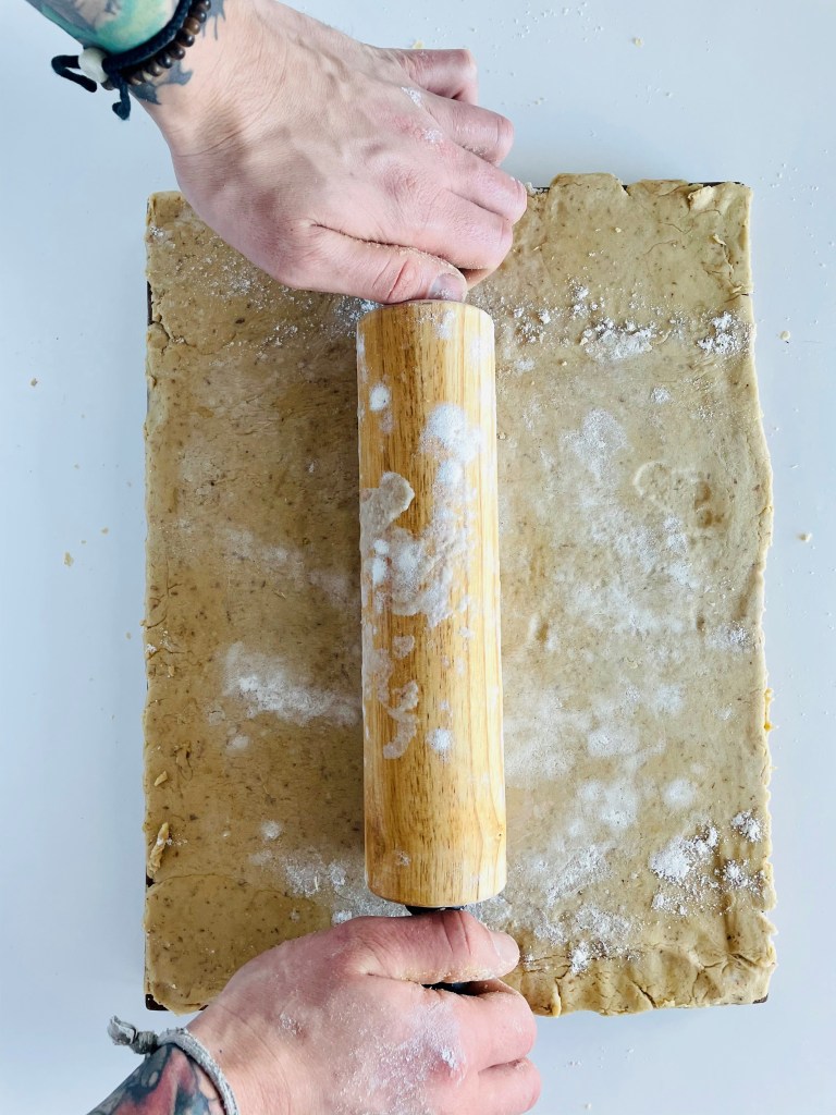 After an hour, flatten the dough on a floured surface with a rolling pin or whatever you have available, then lay down your homemade filling that I’ll explain below.