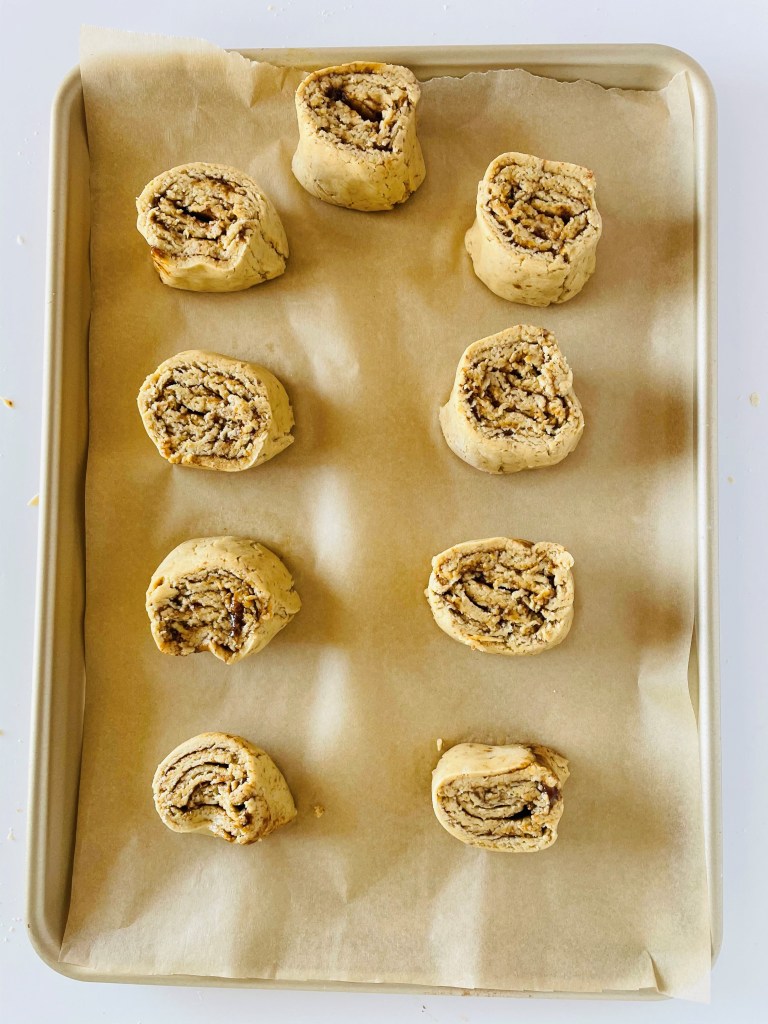 Preheat the oven to 350 degrees and bake them on a cookie sheet with some parchment paper for about 20 minutes.