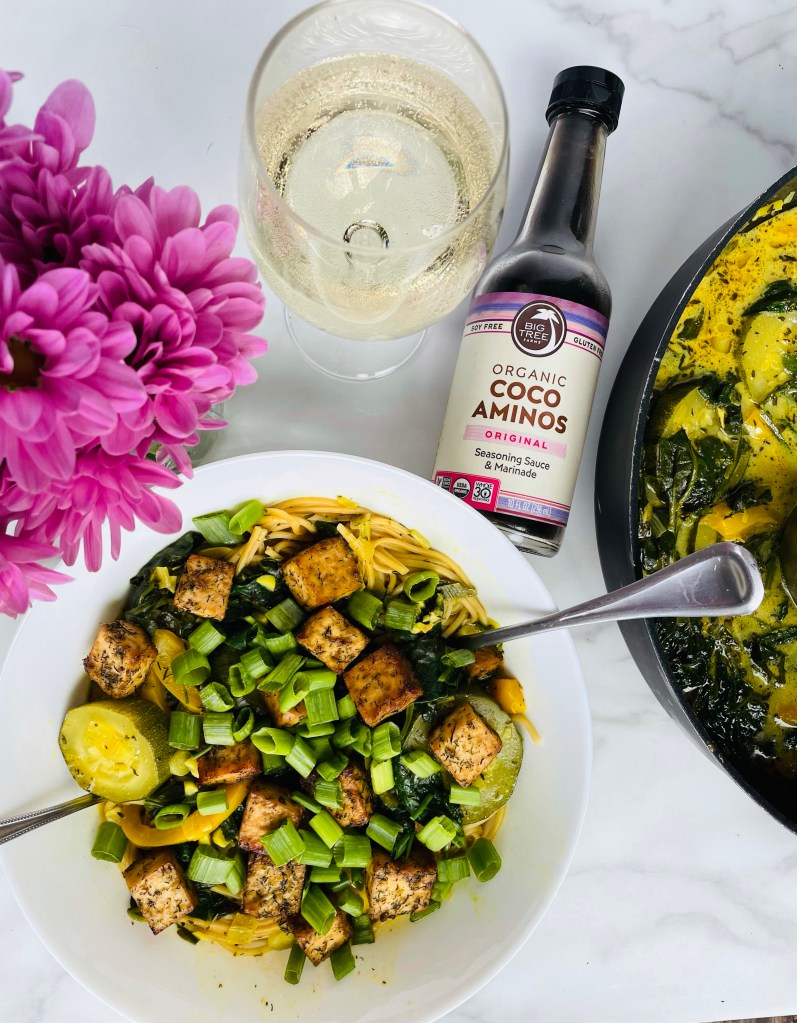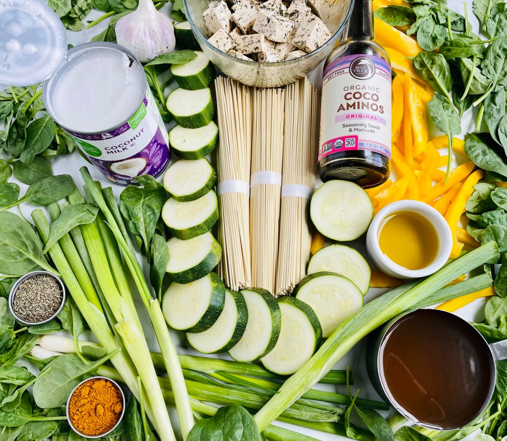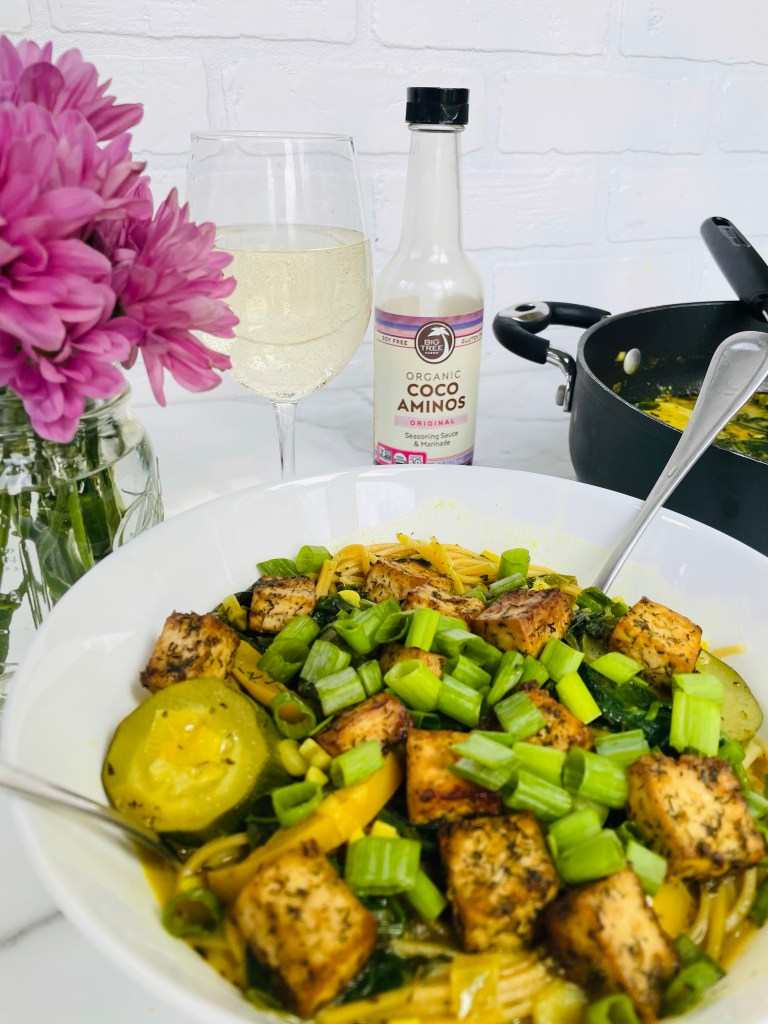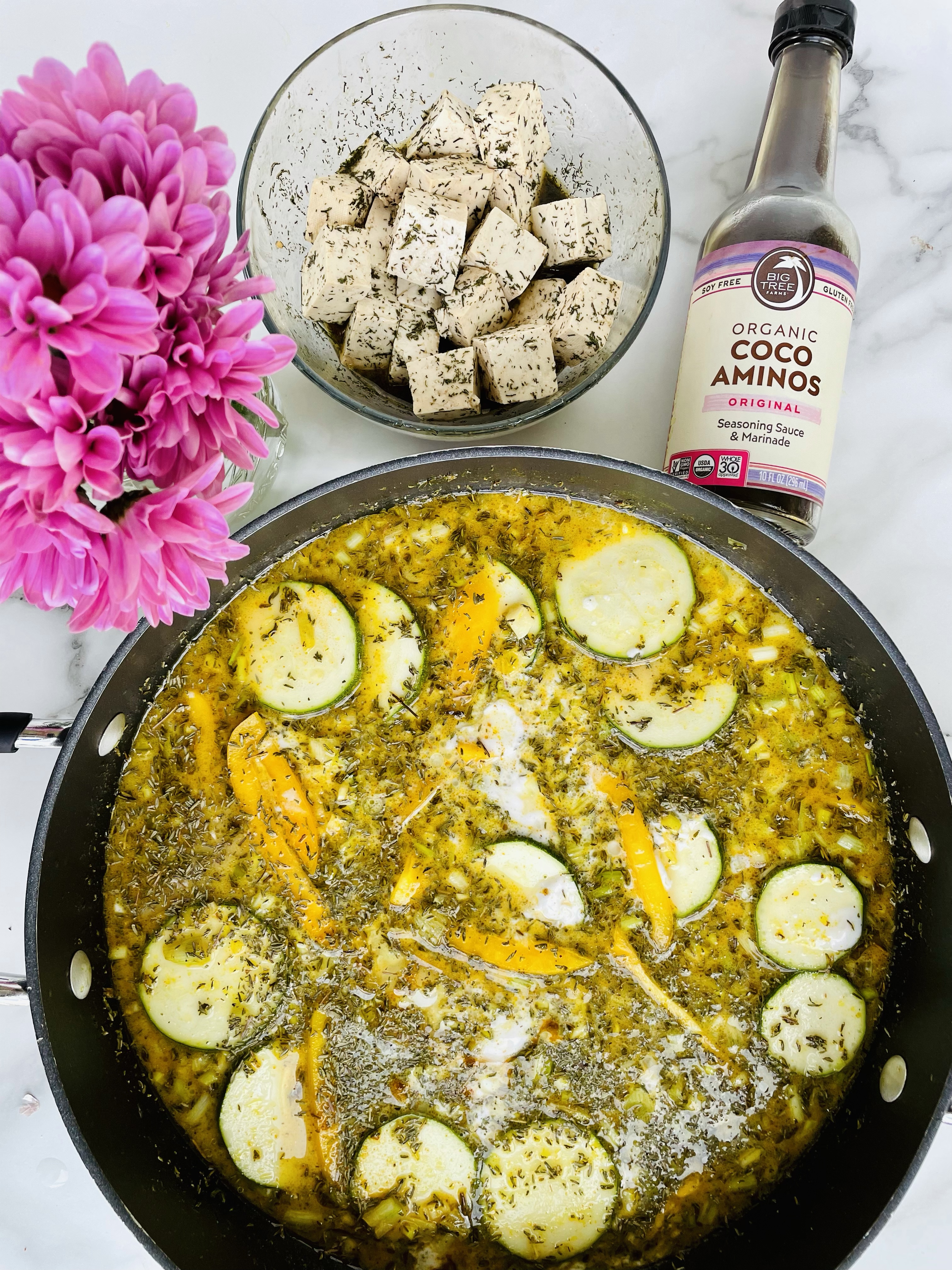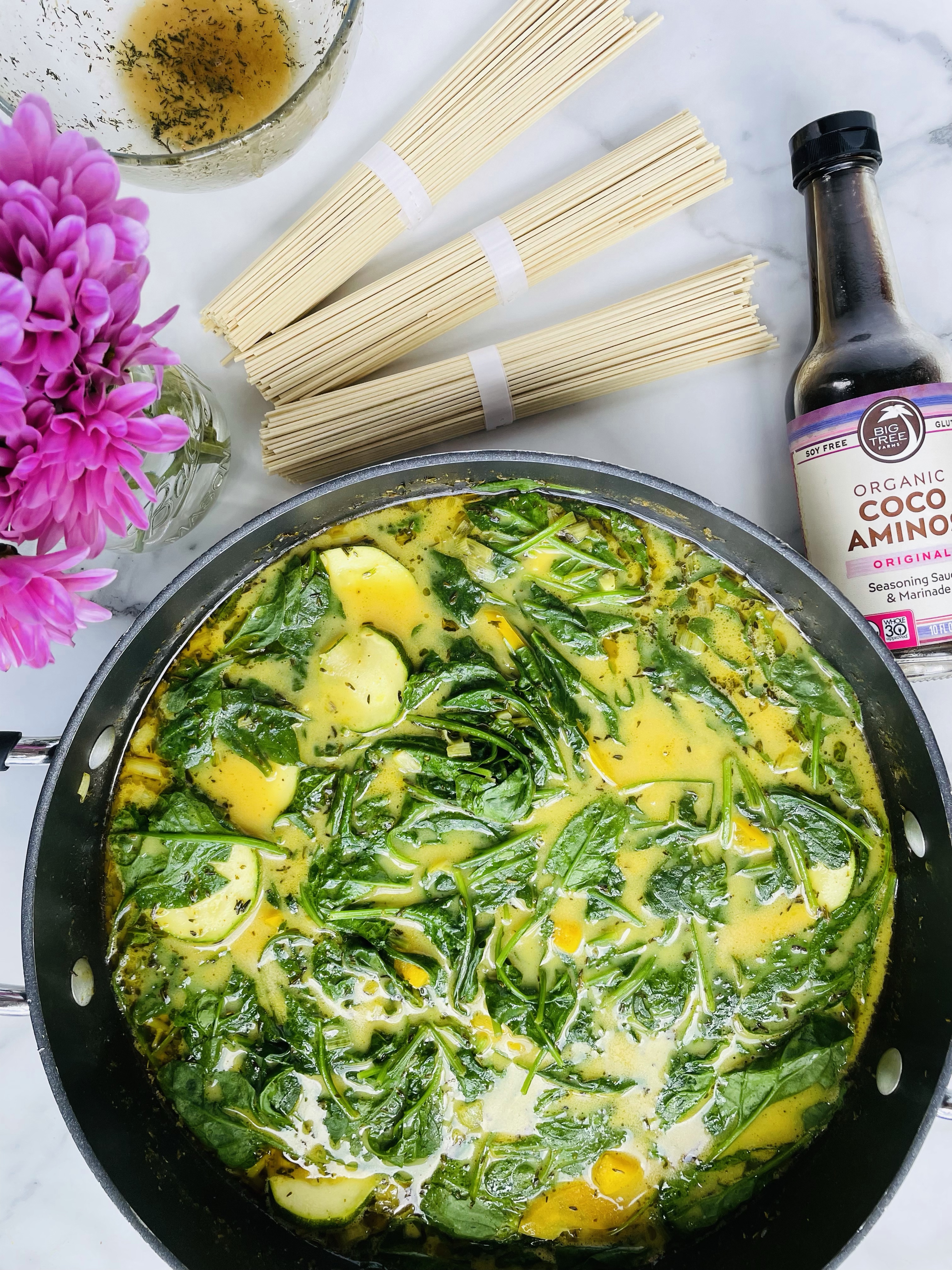 For the veggie broth and noodle portion, I used my favorite brand of ramen noodles to be boiled and eventually added in with the broth. I made the broth by first sautéing the white portions of a bunch of green onions and minced garlic seasoned with curry powder and dried thyme. After letting them cook for a bit, that’s when I drizzled down the coconut aminos, veggie broth, canned coconut milk, zucchini, yellow bell pepper, and spinach to be stirred and simmered for around 10 minutes.
