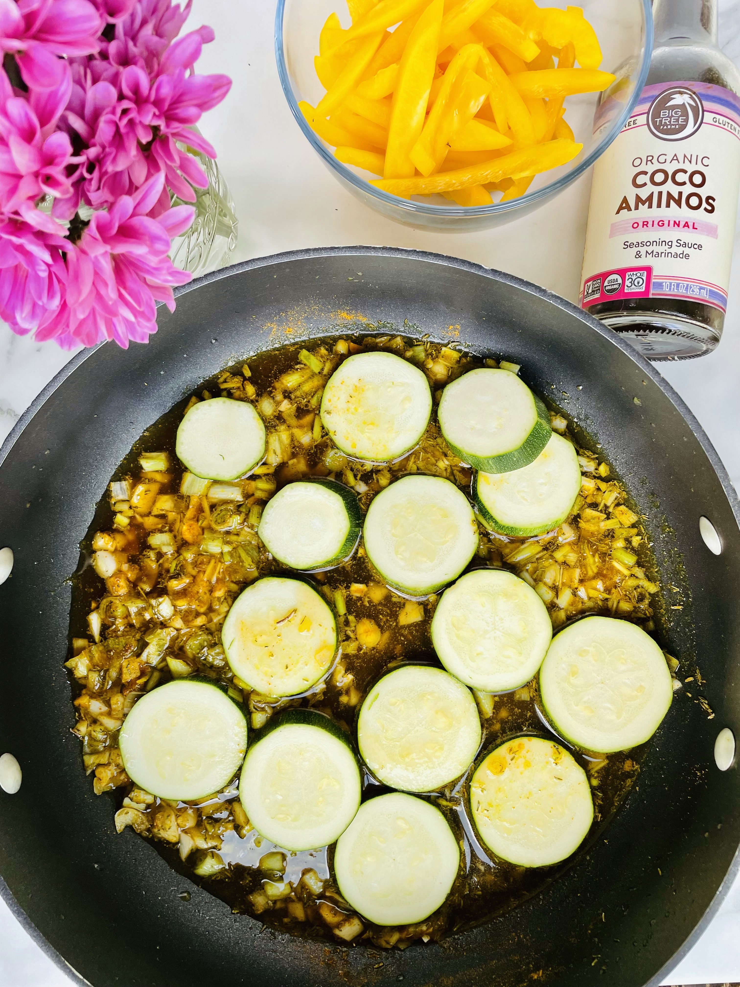 After a few minutes, drizzle down the curry powder, dried thyme, coconut aminos, and veggie broth.