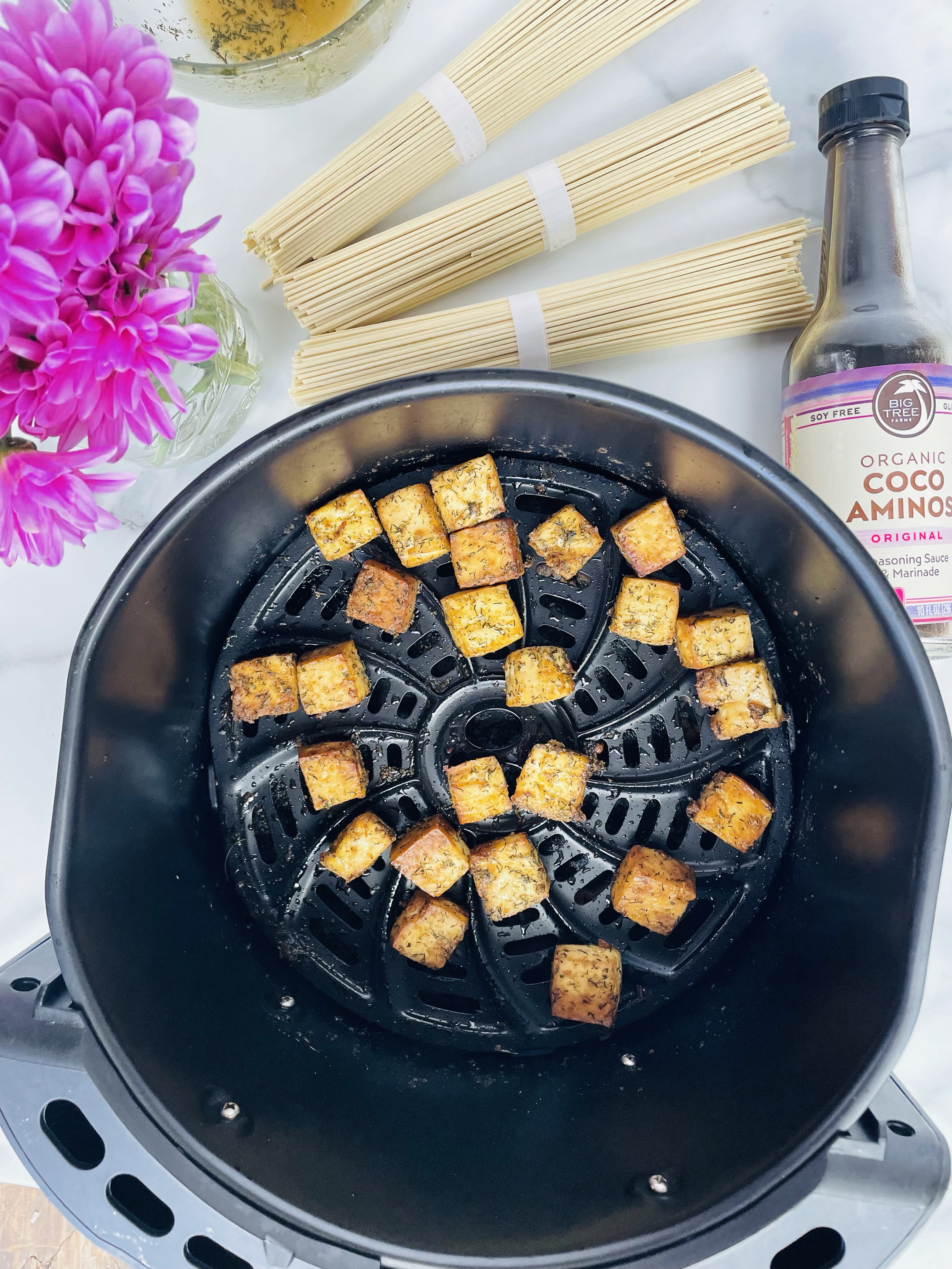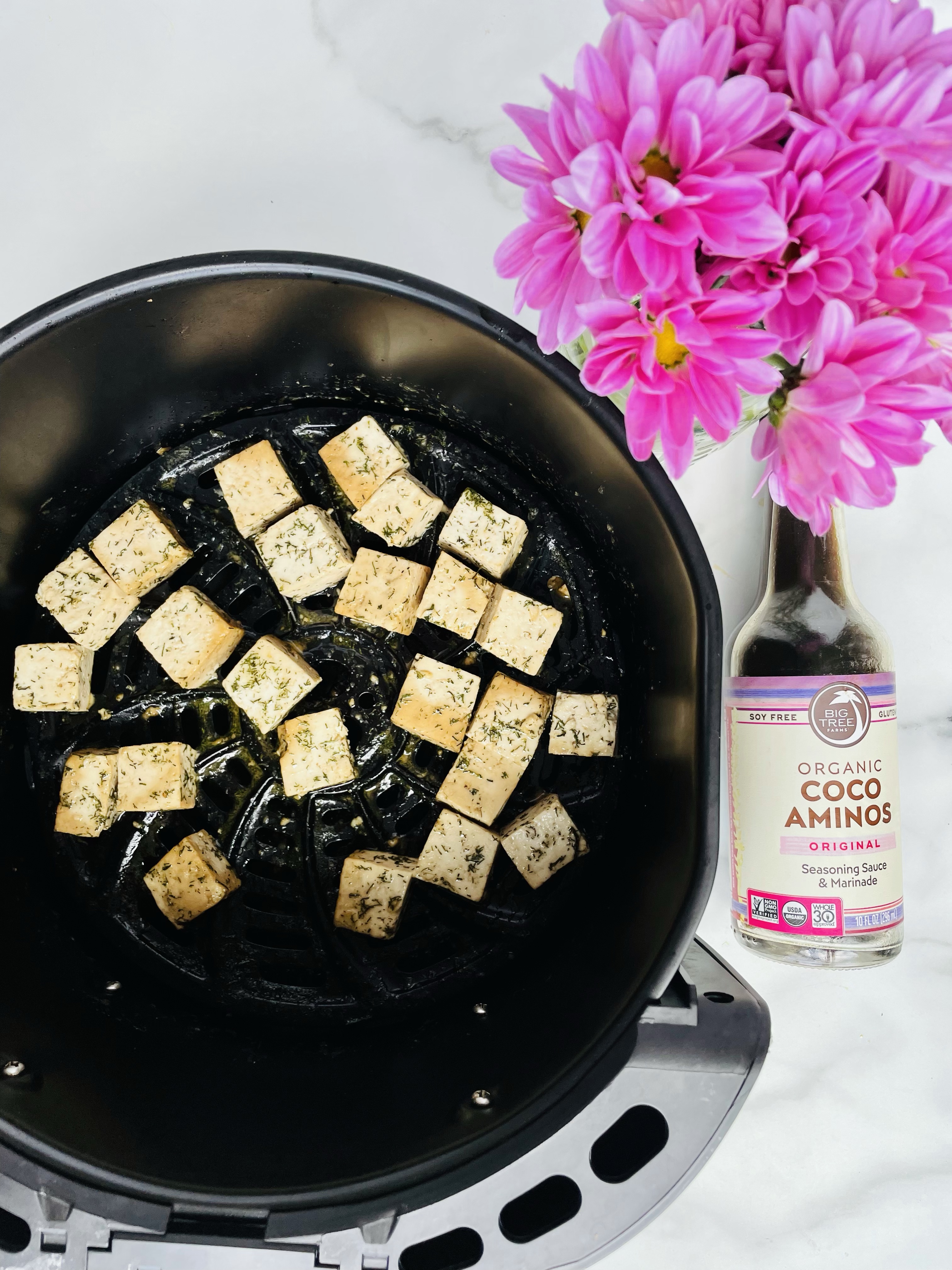 As for the tofu, I made a marinade using toasted sesame oil, coconut aminos, cornstarch, and dried dill weed. After dipping the tofu squares, I air fried them at 375 degrees for 15 minutes for them to be the perfect amount of crispy.