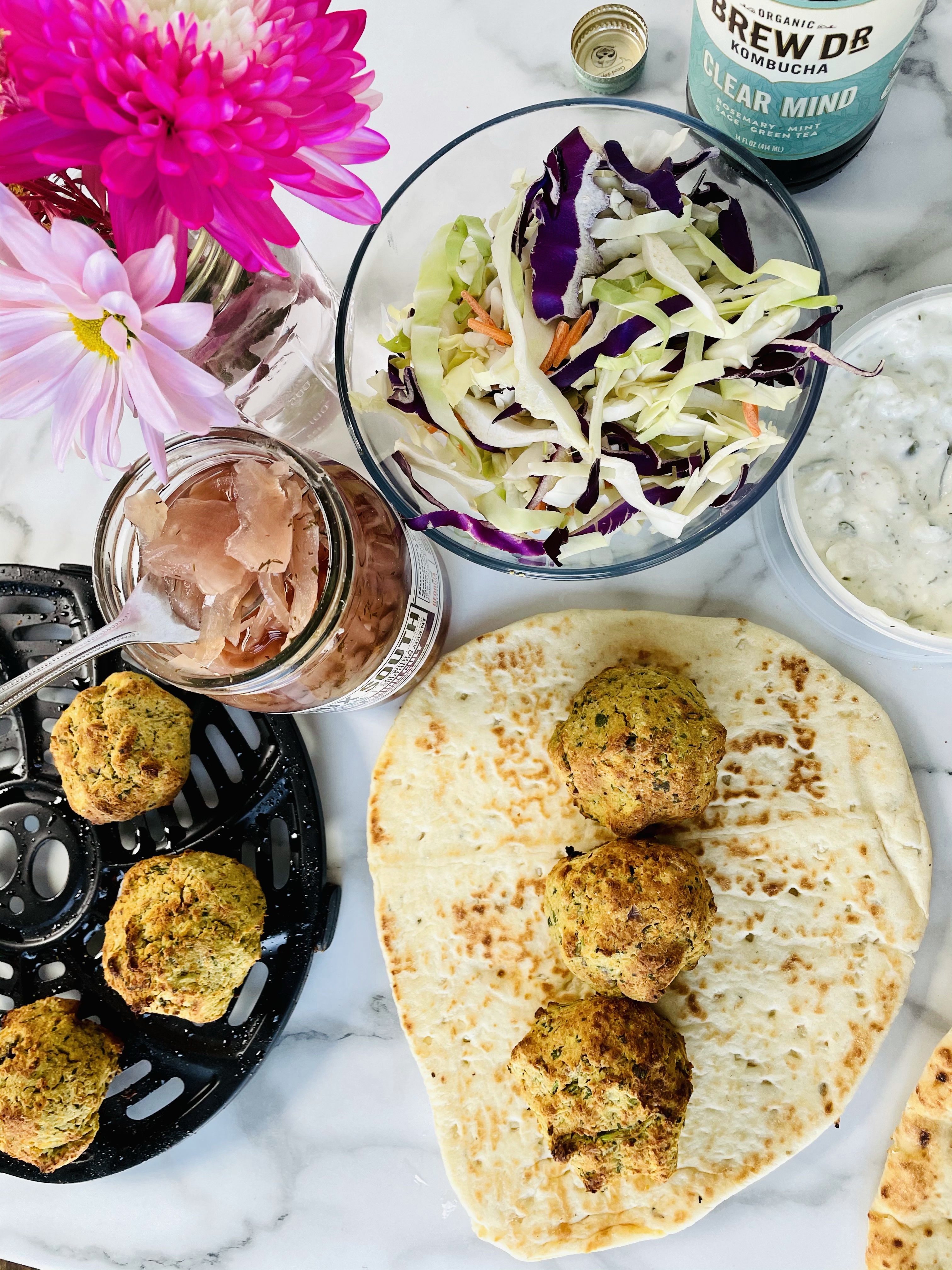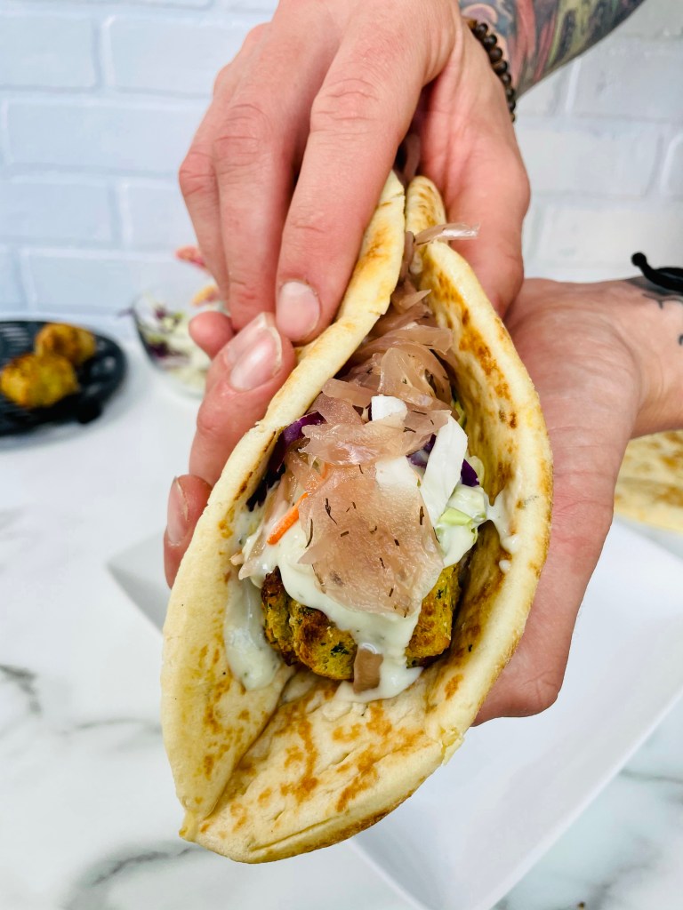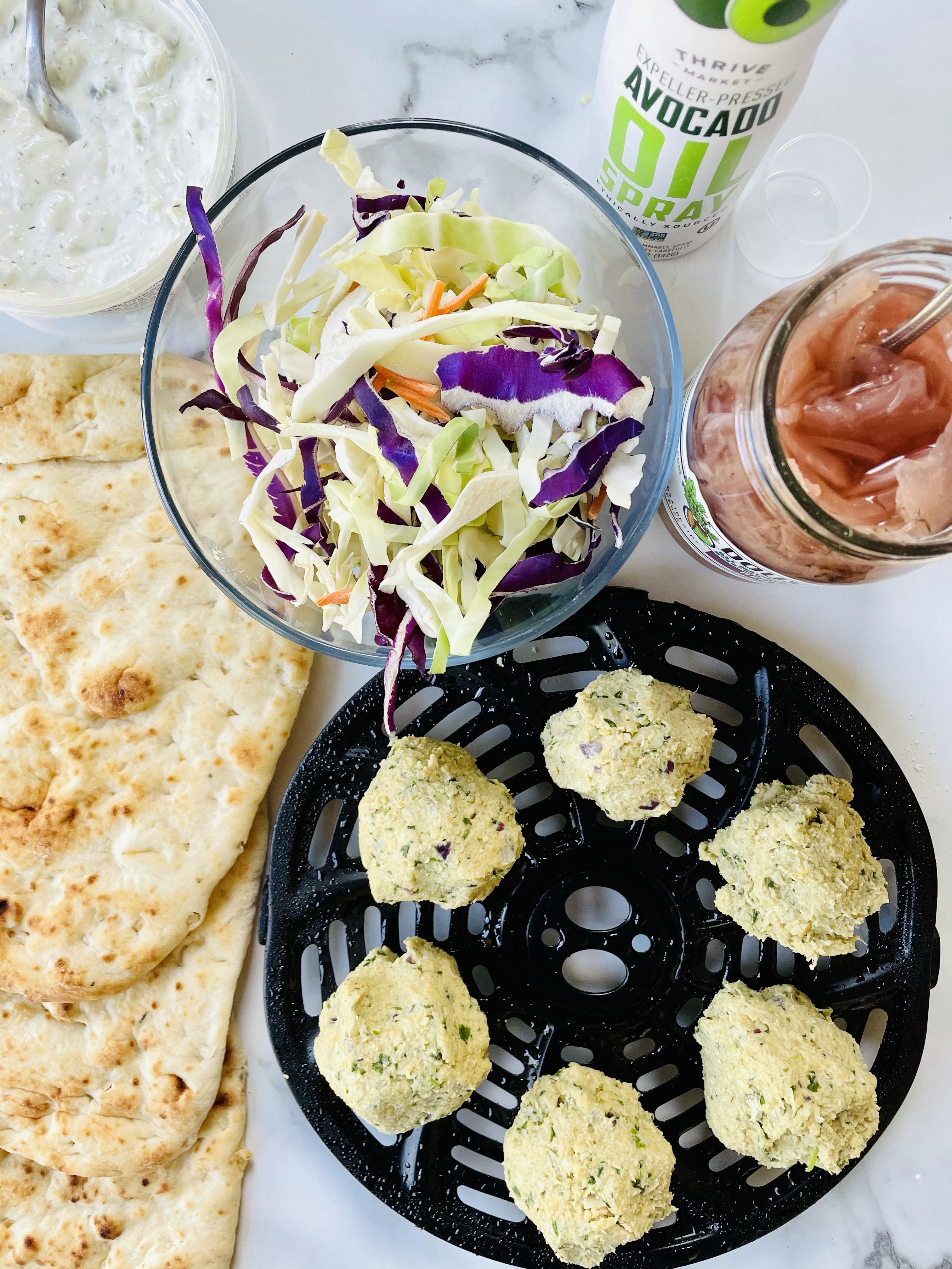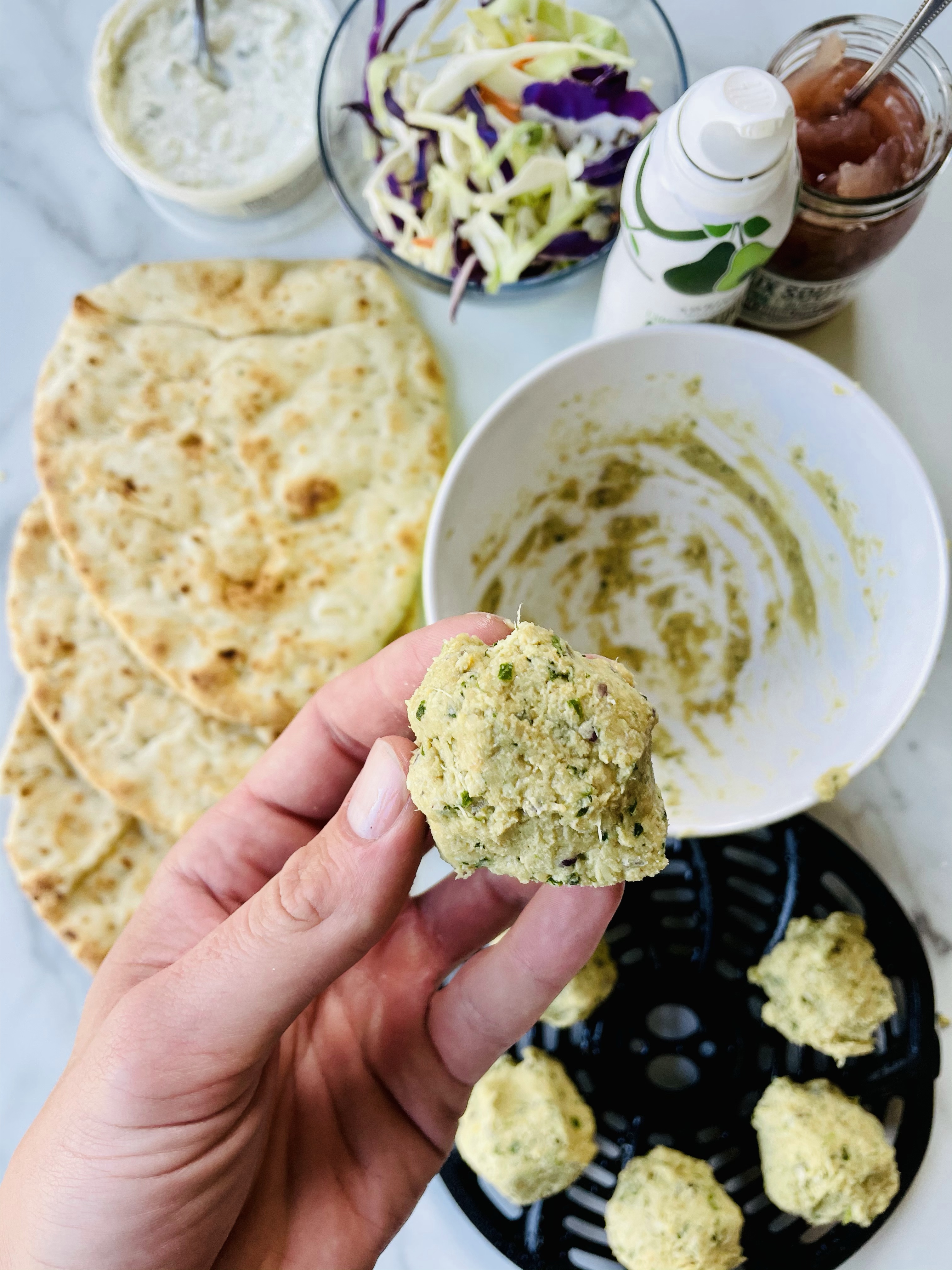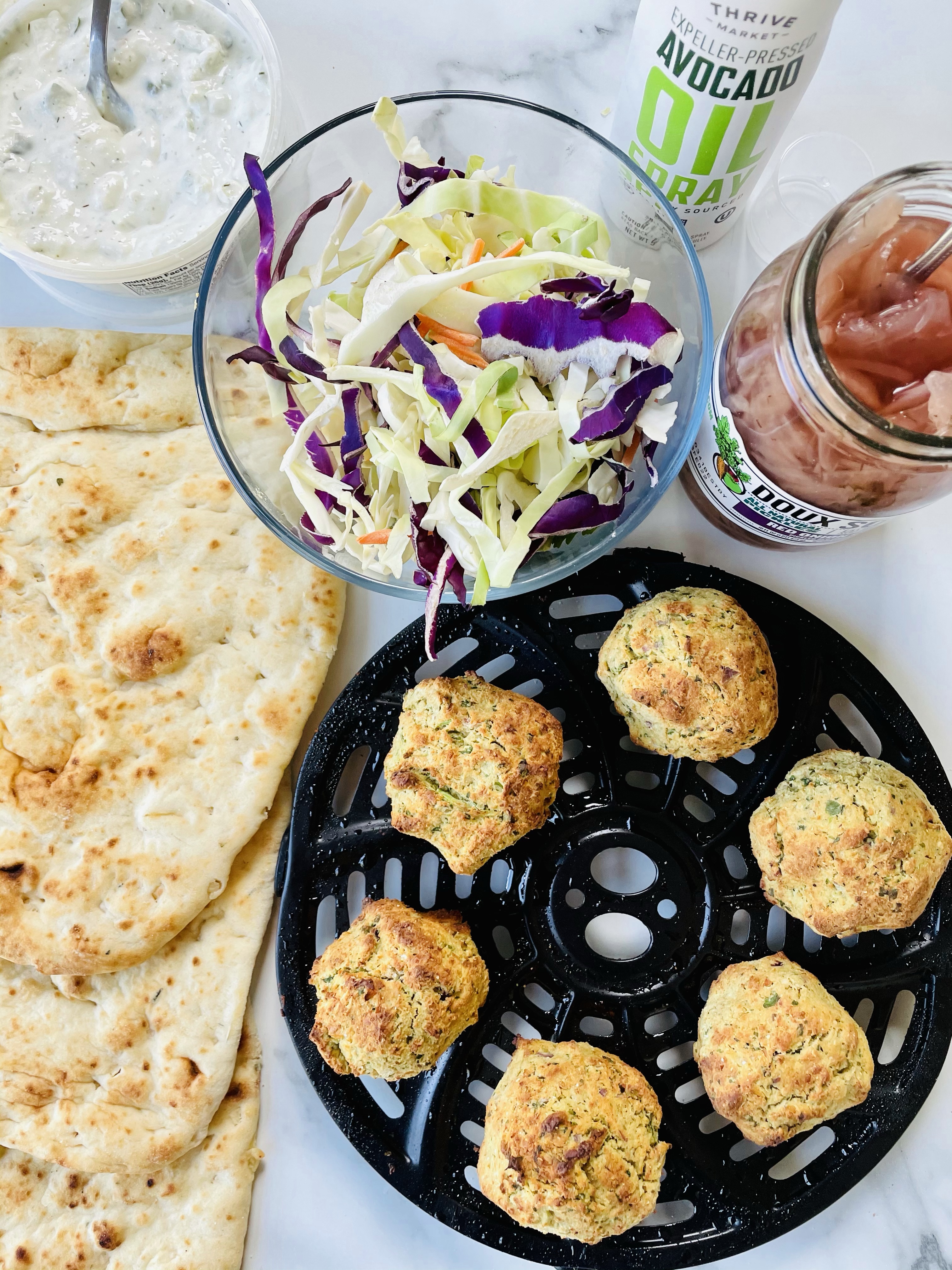 After blending the ingredients, shaping the mixture into balls using your hands, then baking them in my air fryer for 15 minutes, I laid them on top of the naan bread followed by vegan tzatziki sauce from Trader Joes, purple cabbage, shredded carrots, and pickled onions.