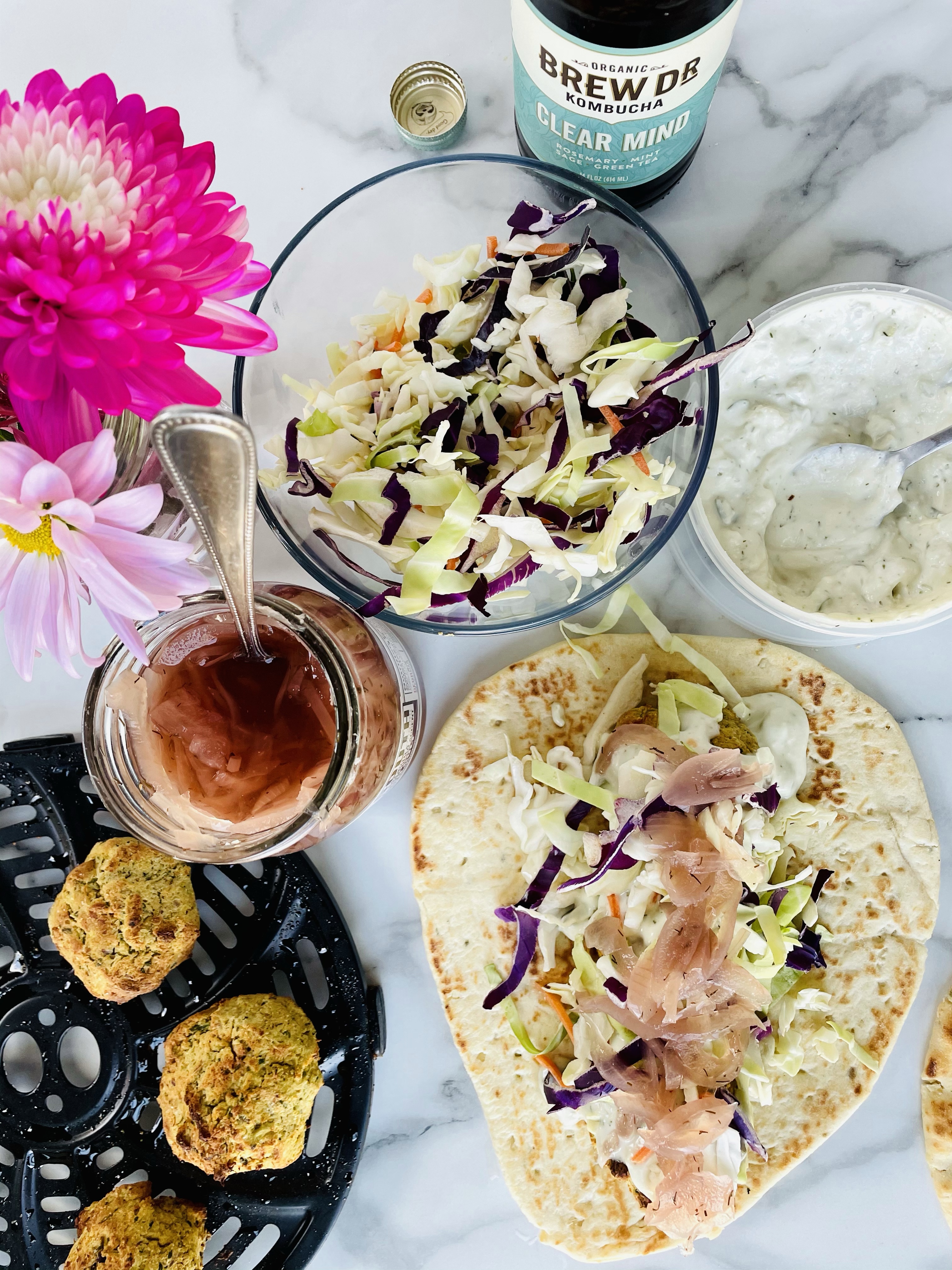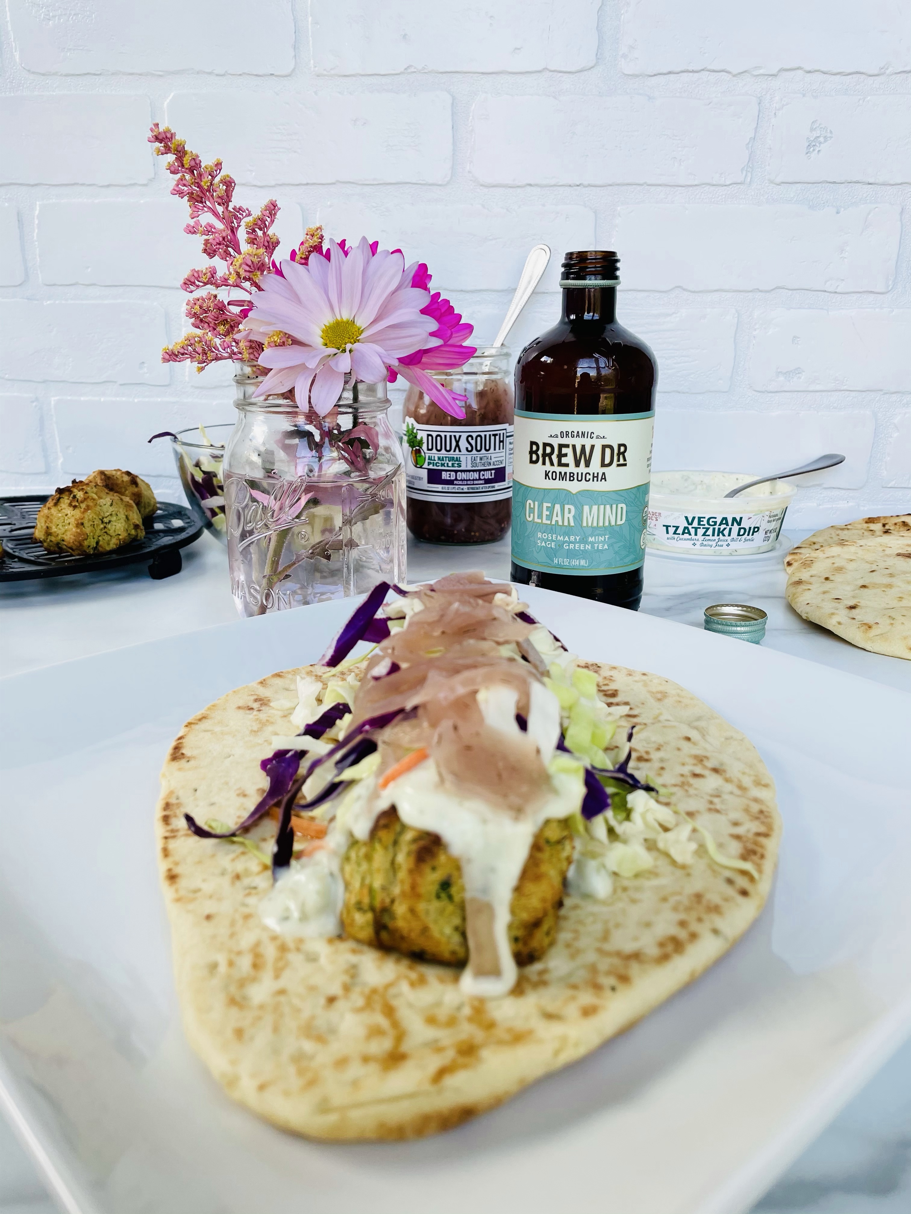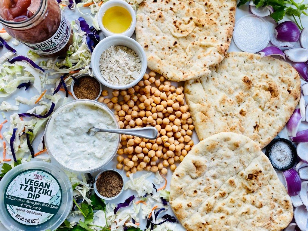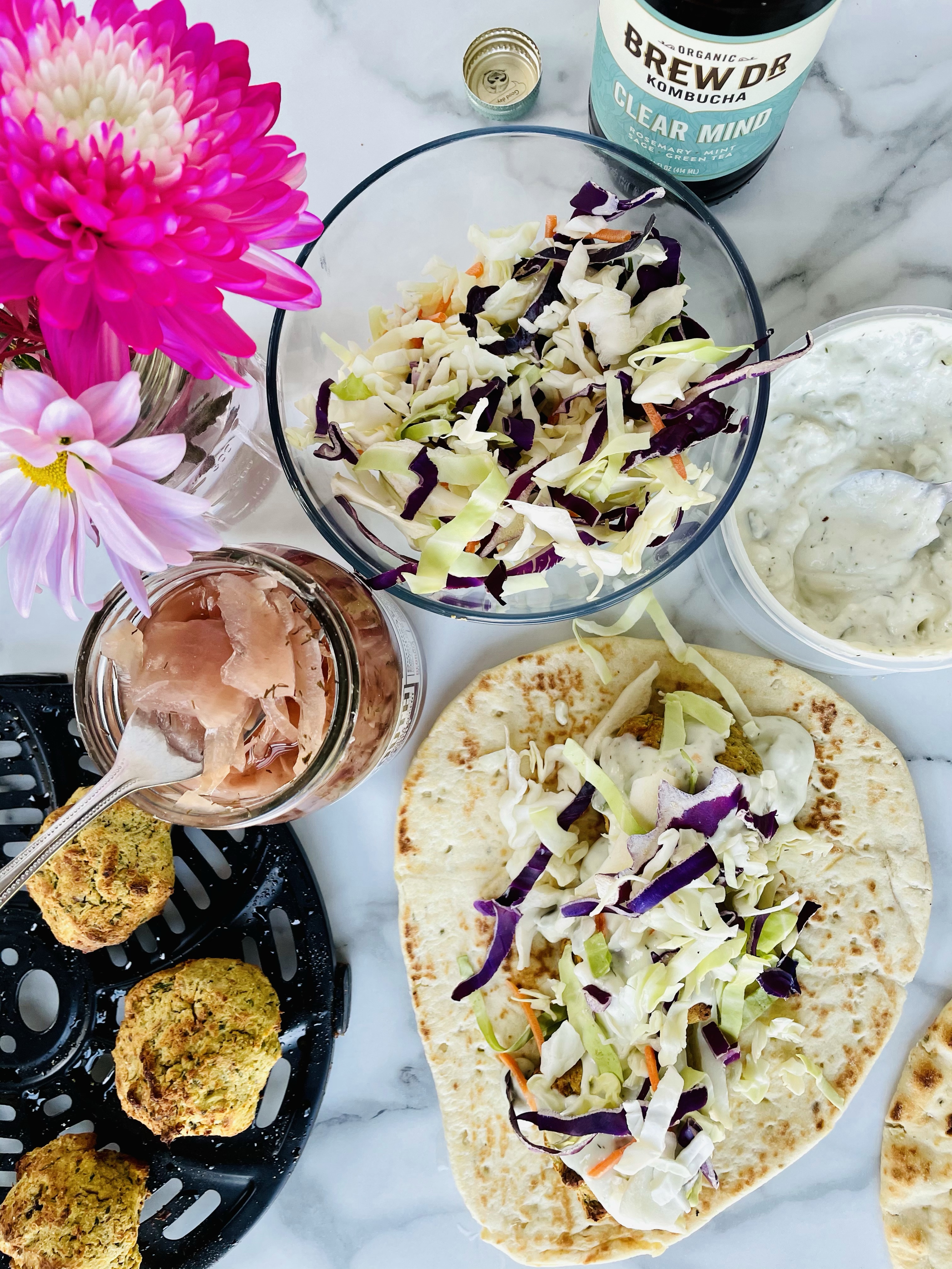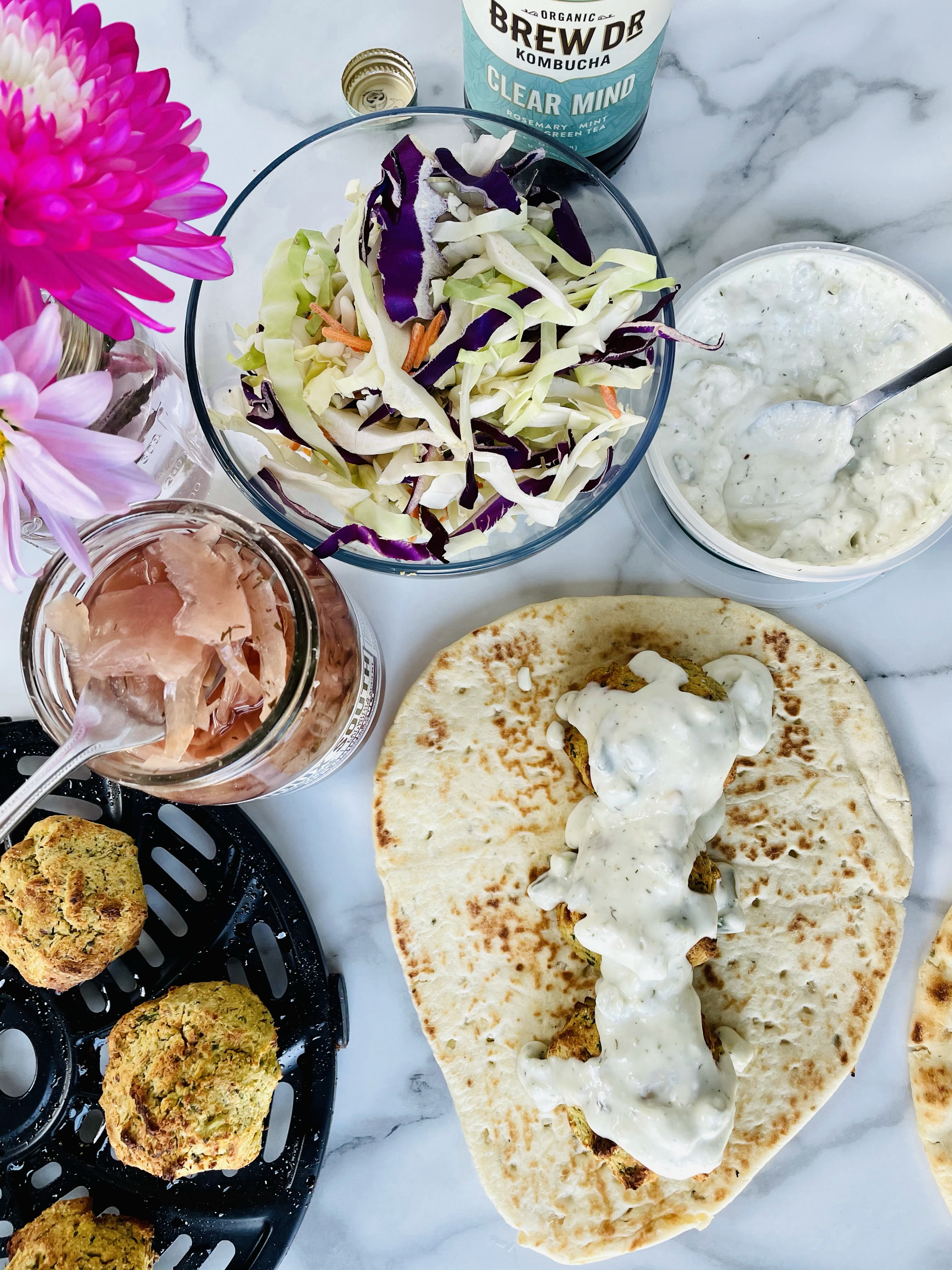 After blending the ingredients, shaping the mixture into balls using your hands, then baking them in my air fryer for 15 minutes, I laid them on top of the naan bread followed by vegan tzatziki sauce from Trader Joes, purple cabbage, shredded carrots, and pickled onions.