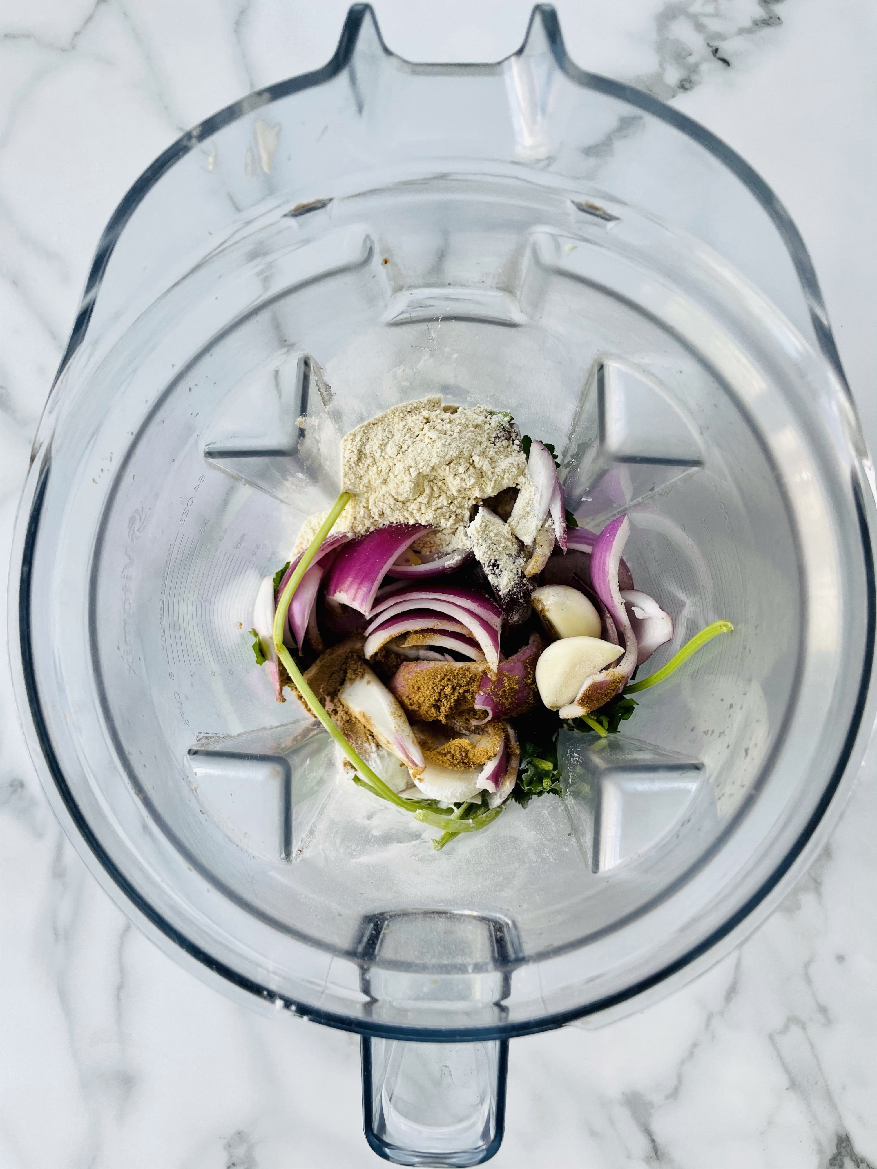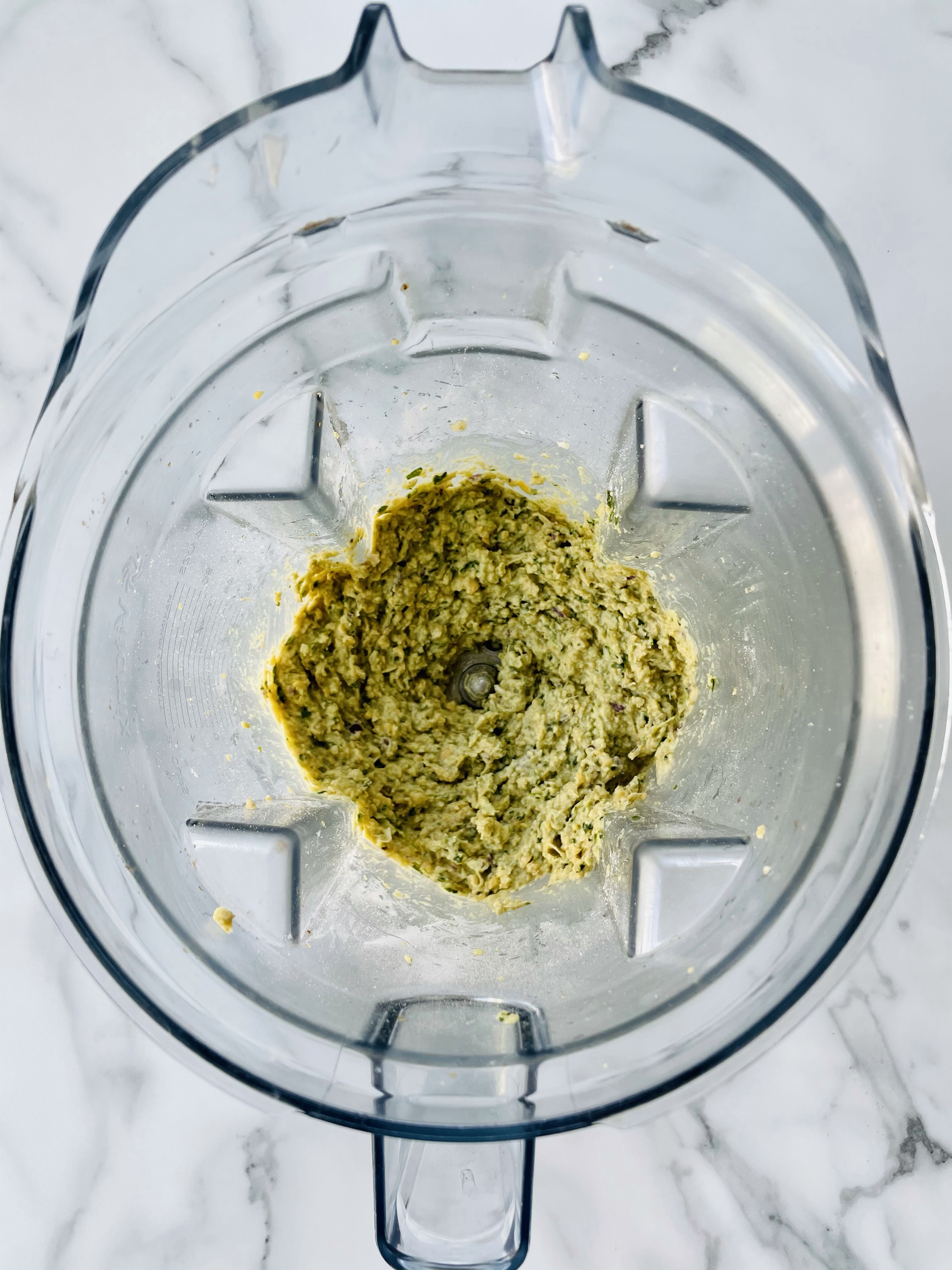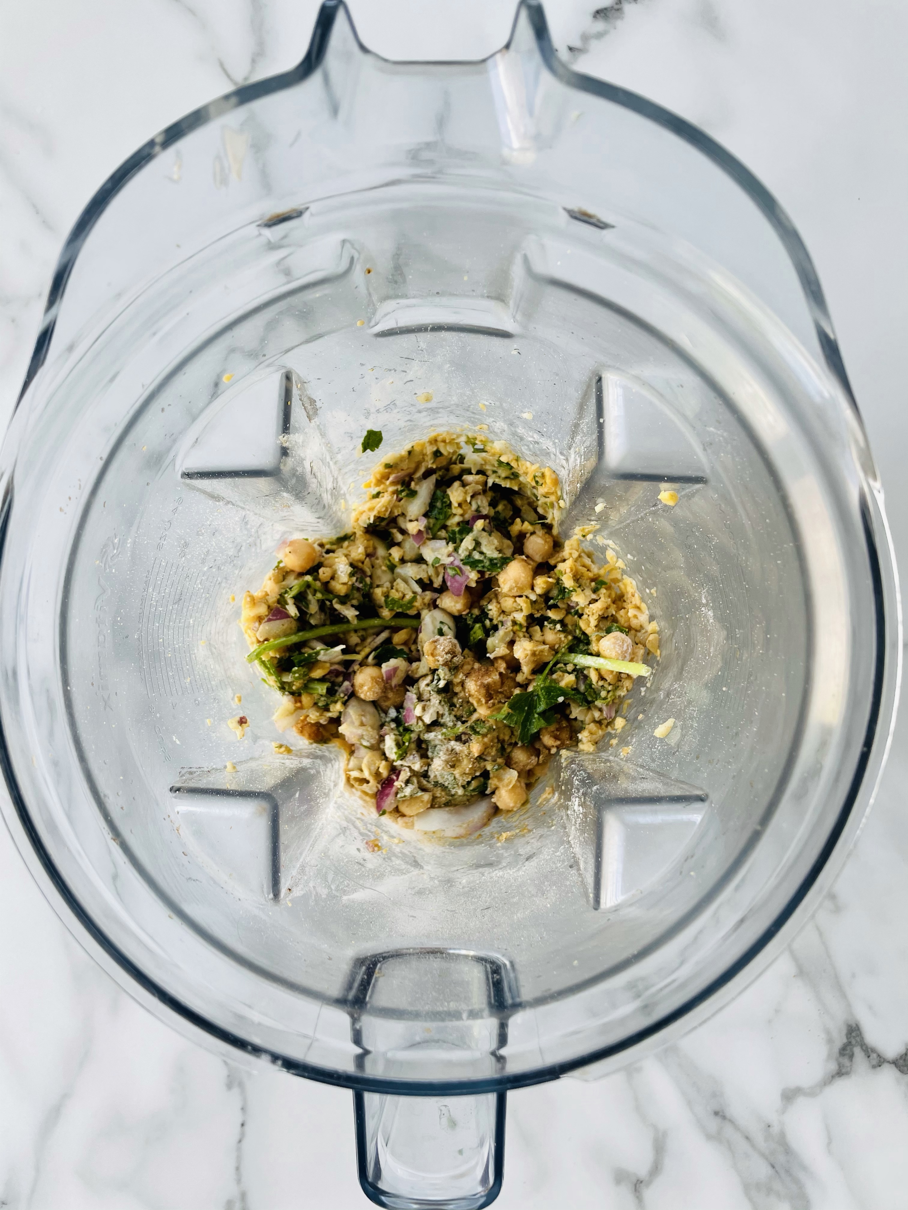 In a high speed blender or food processor, pulse together the falafel ingredients such as the chickpeas, chickpea flour, parsley, red onion, garlic, cumin, coriander, salt/pepper, baking soda, and avocado oil. Don’t be scared to scrape down the sides every so often if ya have to.