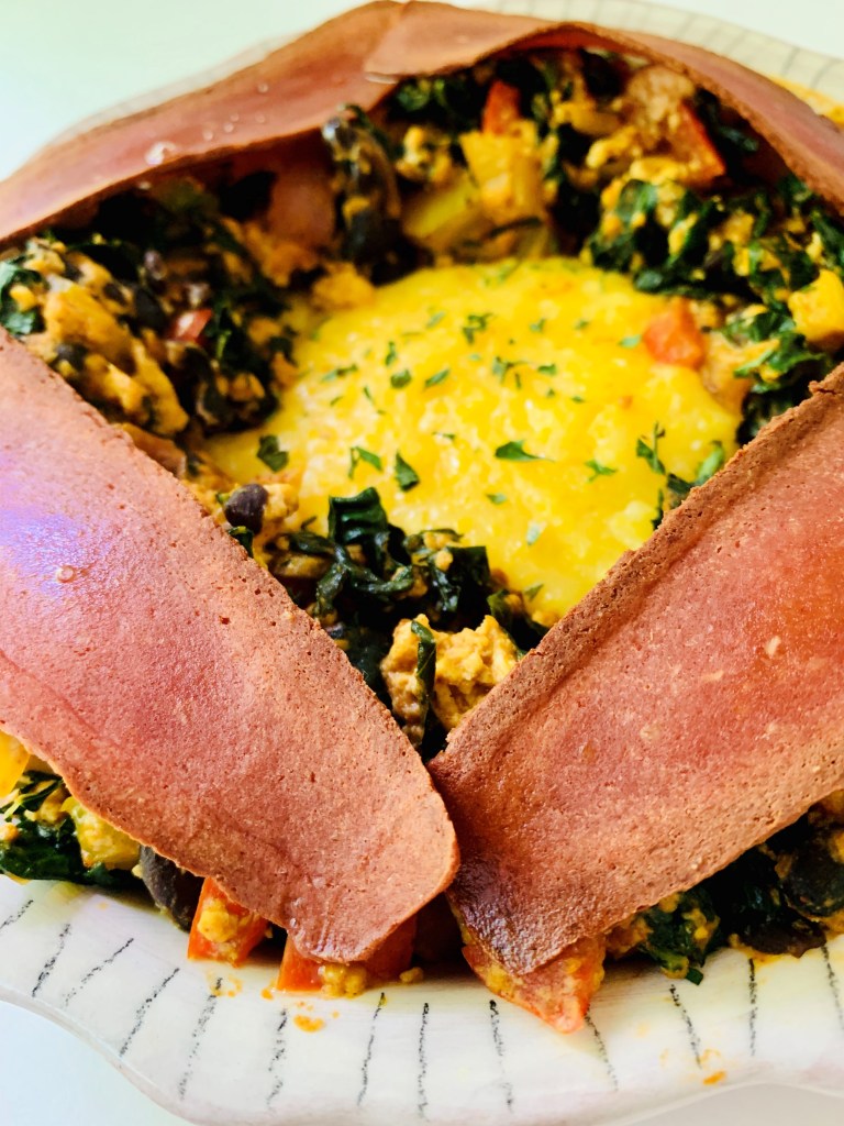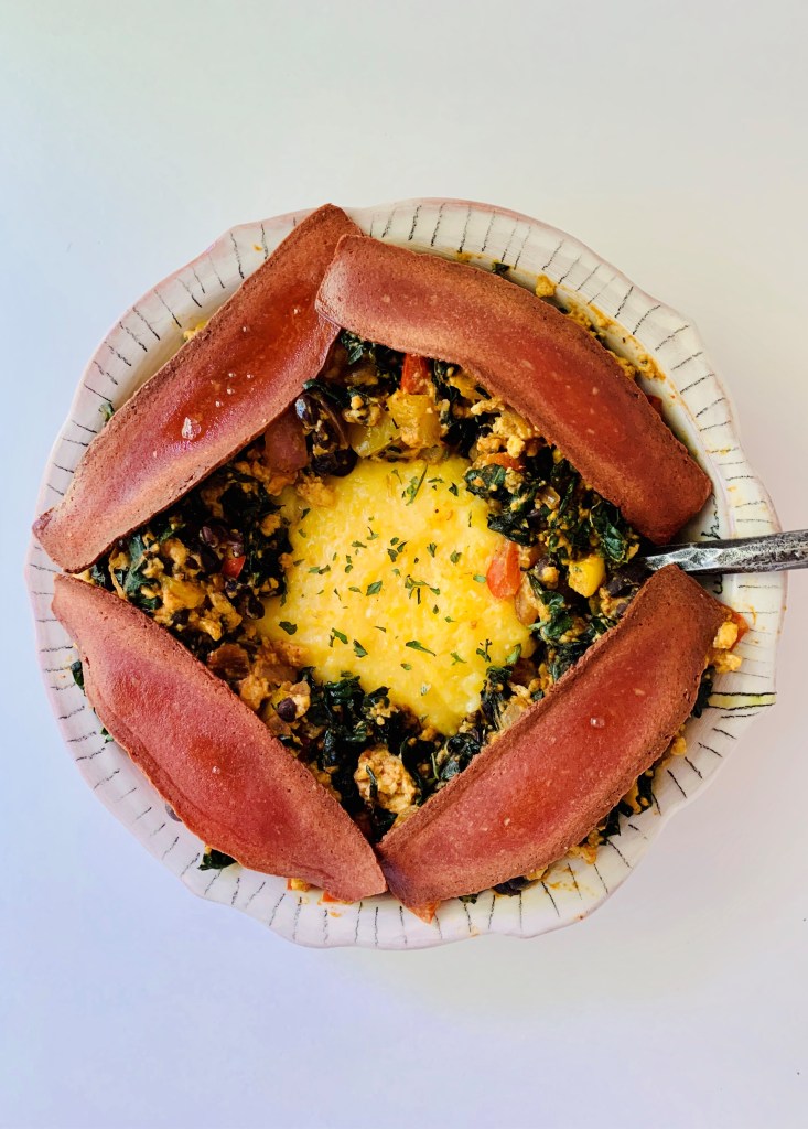 Not only does this meal feature the lovely and tasty grits all of us southern people know and love, it is also packed with a loaded tofu scramble including onions, peppers, garlic, kale, black beans, tofu and of course the wonderful spice turmeric that has all kinds of healing components in itself.