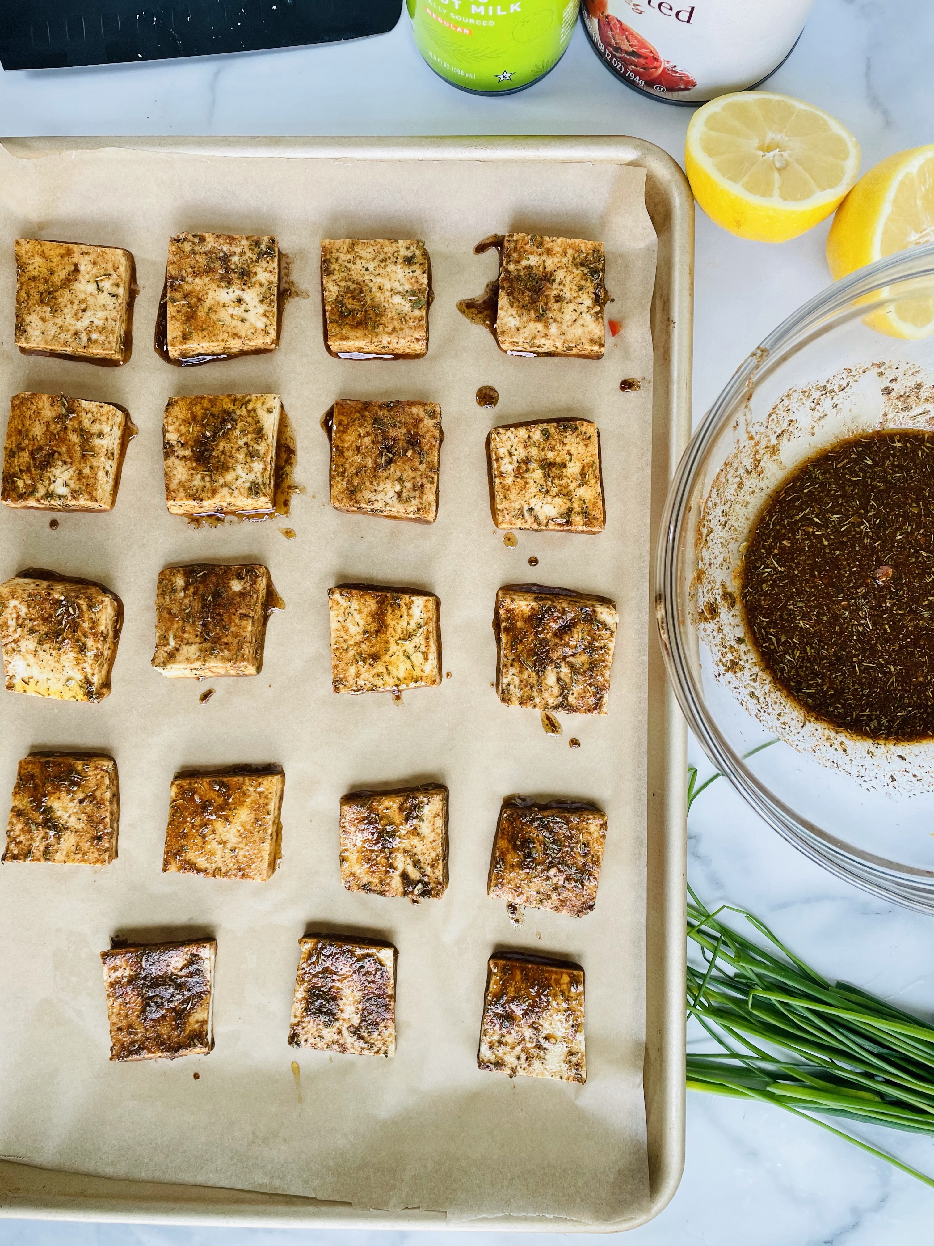 Chop the tofu into squares, dip them in the jerk mixture, then evenly transfer them to a large baking lined with parchment paper.