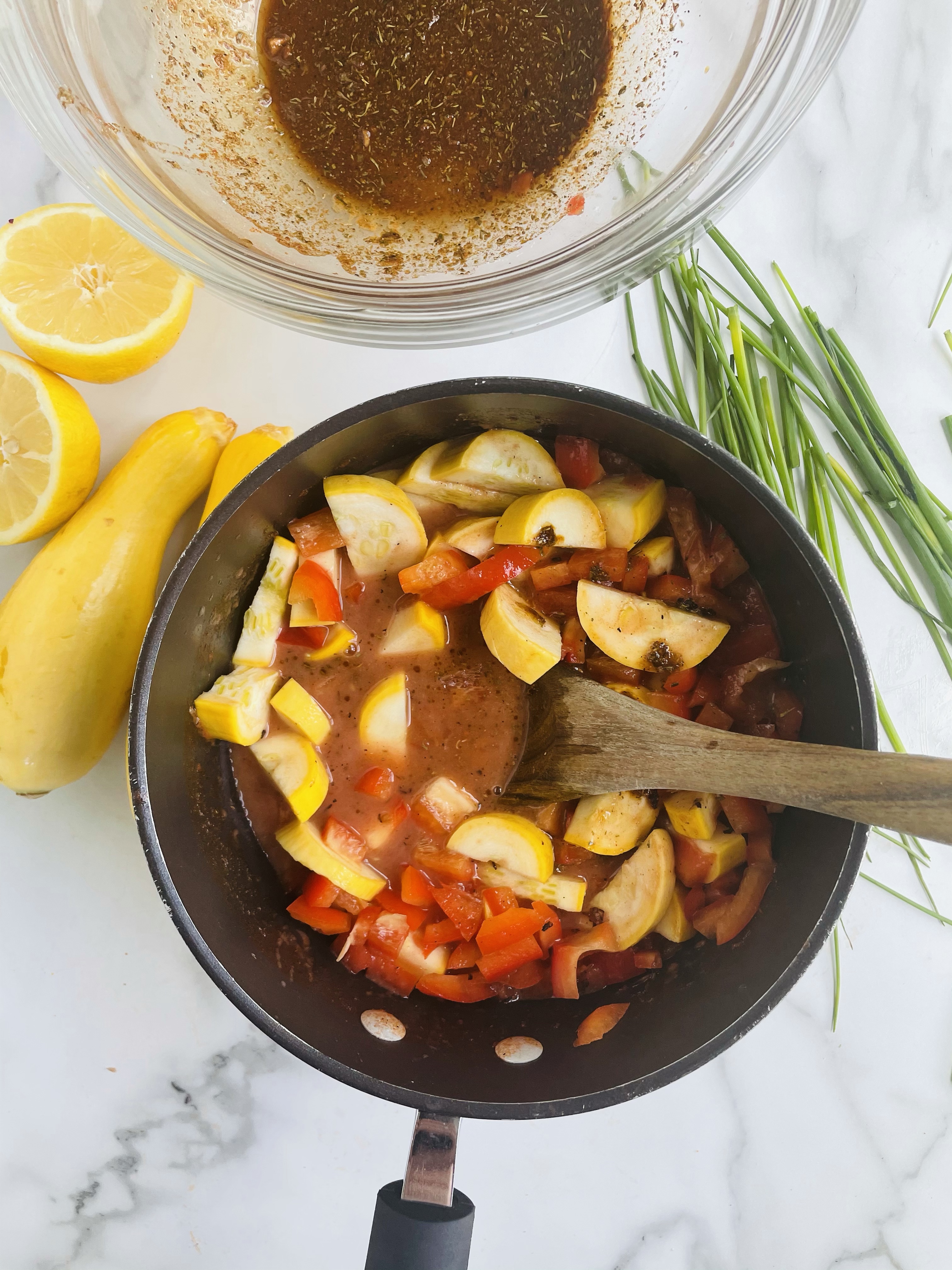 Add in the salt and pepper, followed by the yellow squash and red bell pepper and allow the sauce to simmer for up to 6 minutes.