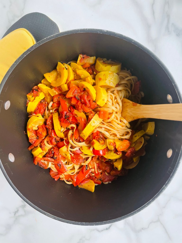 As for the veggie linguine part, it was super easy and turned out to be the perfect match for the tofu. Before boiling the pasta, I whipped up a quick sauce out of fire roasted tomatoes, full fat coconut milk, salt, and pepper to be simmered with chopped yellow squash and a red bell pepper.