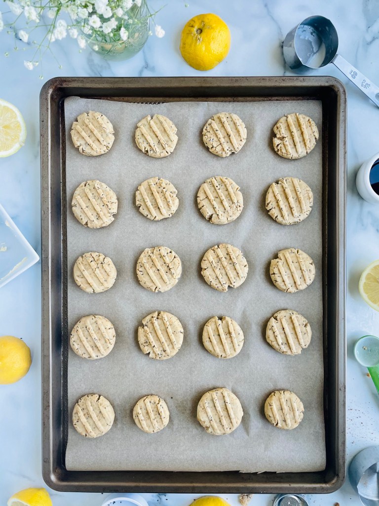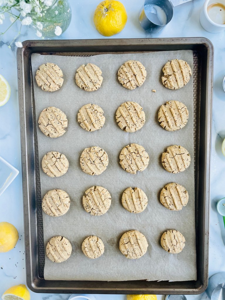These cookies are made with cassava flour, coconut sugar, chia seeds, baking powder, vegan butter, oat milk, lemon extract, lemon zest, and salt that I gently stirred together until super crumbly. After preheating the oven to 350 degrees, I baked them on a large baking sheet covered in parchment paper for 15 minutes, leaving them to be perfectly chewy and delicious.