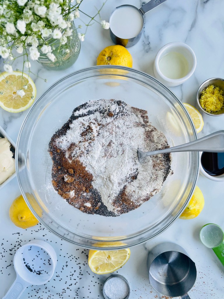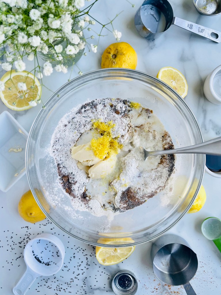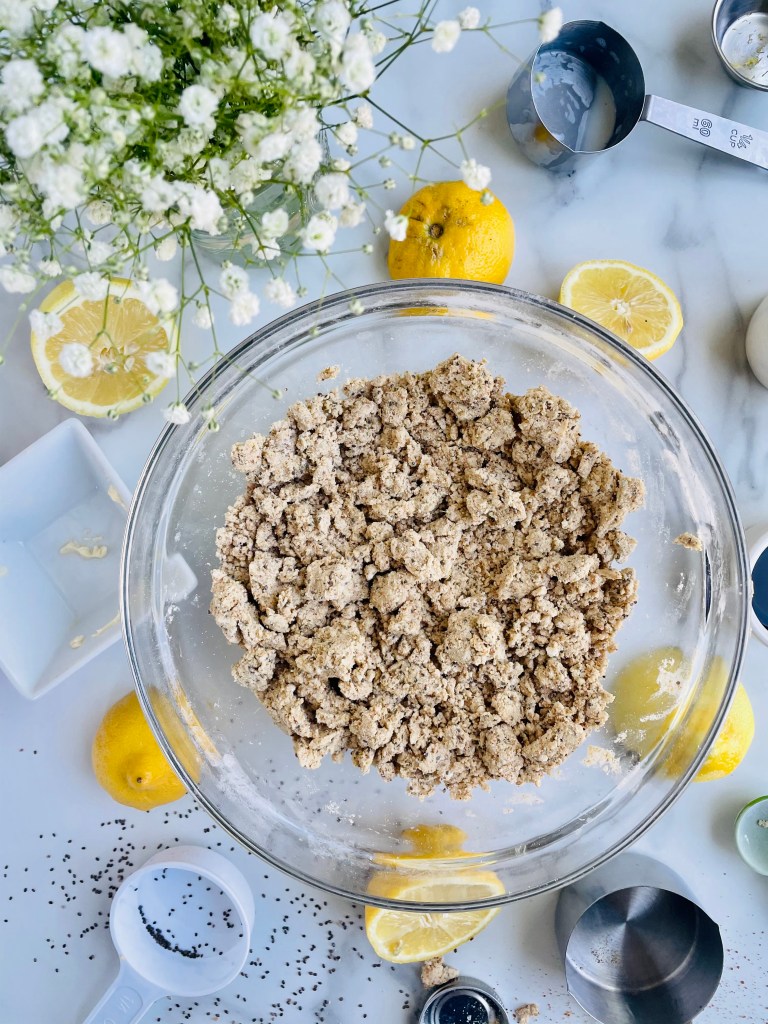 Fold in the butter, oat milk, lemon extract, and lemon zest, then gently stir until you have a crumbly batter. Use your hands if you have to, and maybe even check out the picture I have above for an idea of what it should look like.