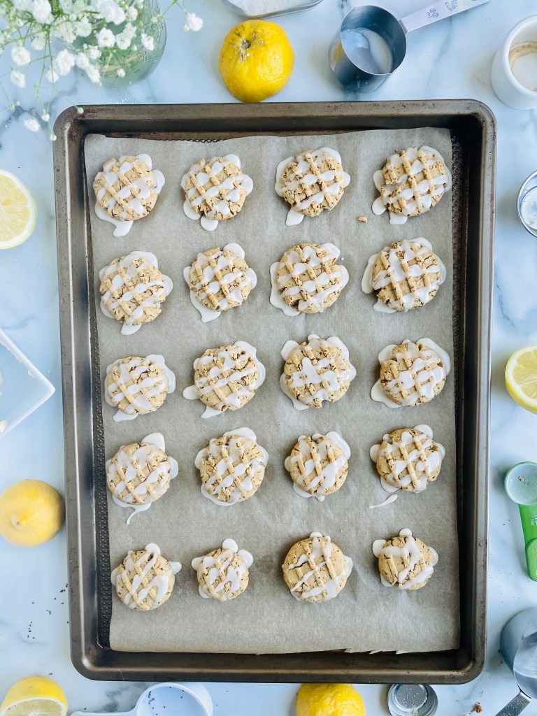 Bake for 15 minutes and allow the cookies to cool before drizzling down the vanilla glaze.