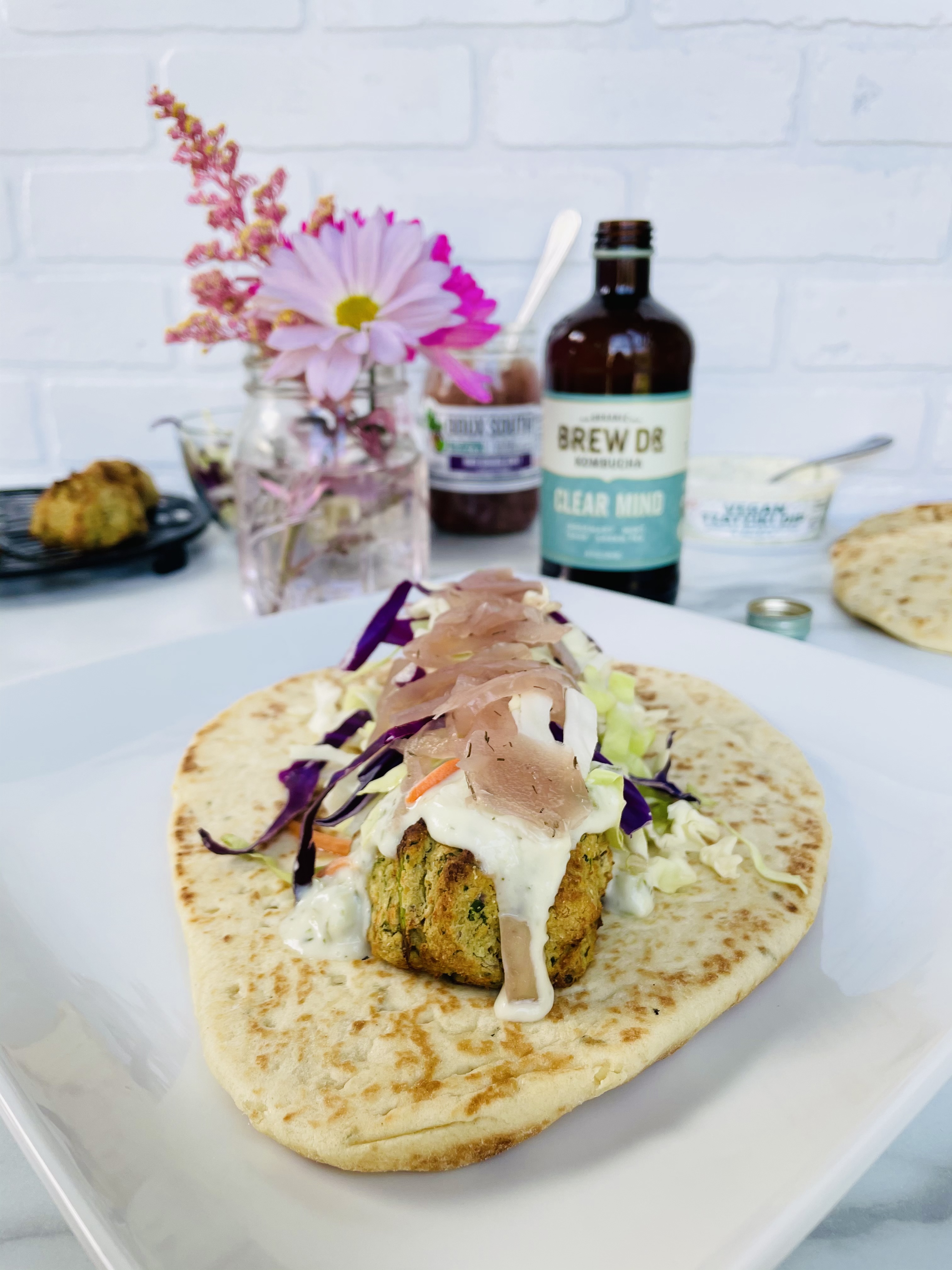 Homemade falafel balls wrapped in garlic naan bread and topped with vegan Tzatziki sauce, purple cabbage, shredded carrots, and pickled onions.