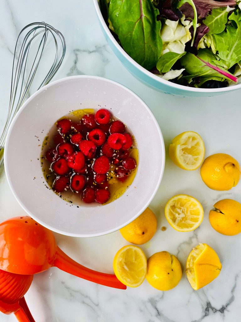 For the dressing, blend the raspberries, apple cider vinegar, olive oil, Dijon mustard, squeezed lemon juice, everything seasoning, and agave syrup until you notice the raspberry seeds disappear.