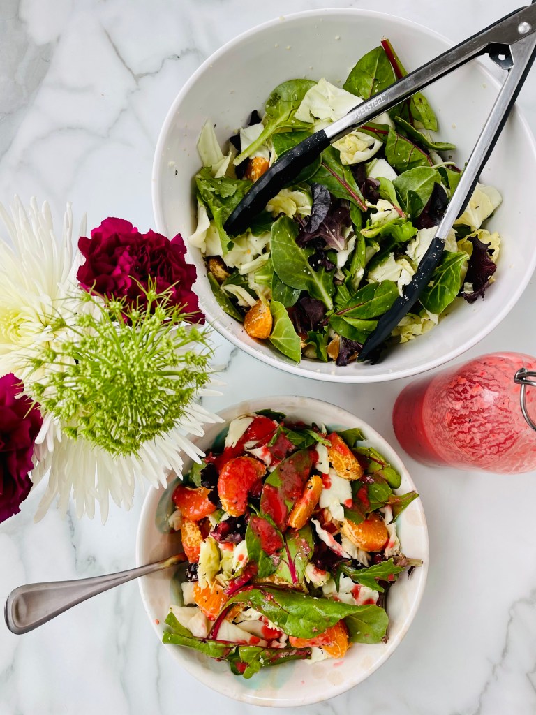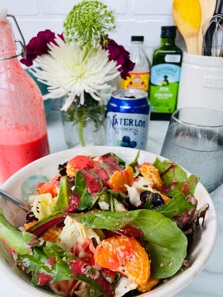 In my case, I celebrated the warmer days we’ve been having with this stunning mandarin salad that I topped with a homemade raspberry vinaigrette, hemp hearts, and dried cranberries.