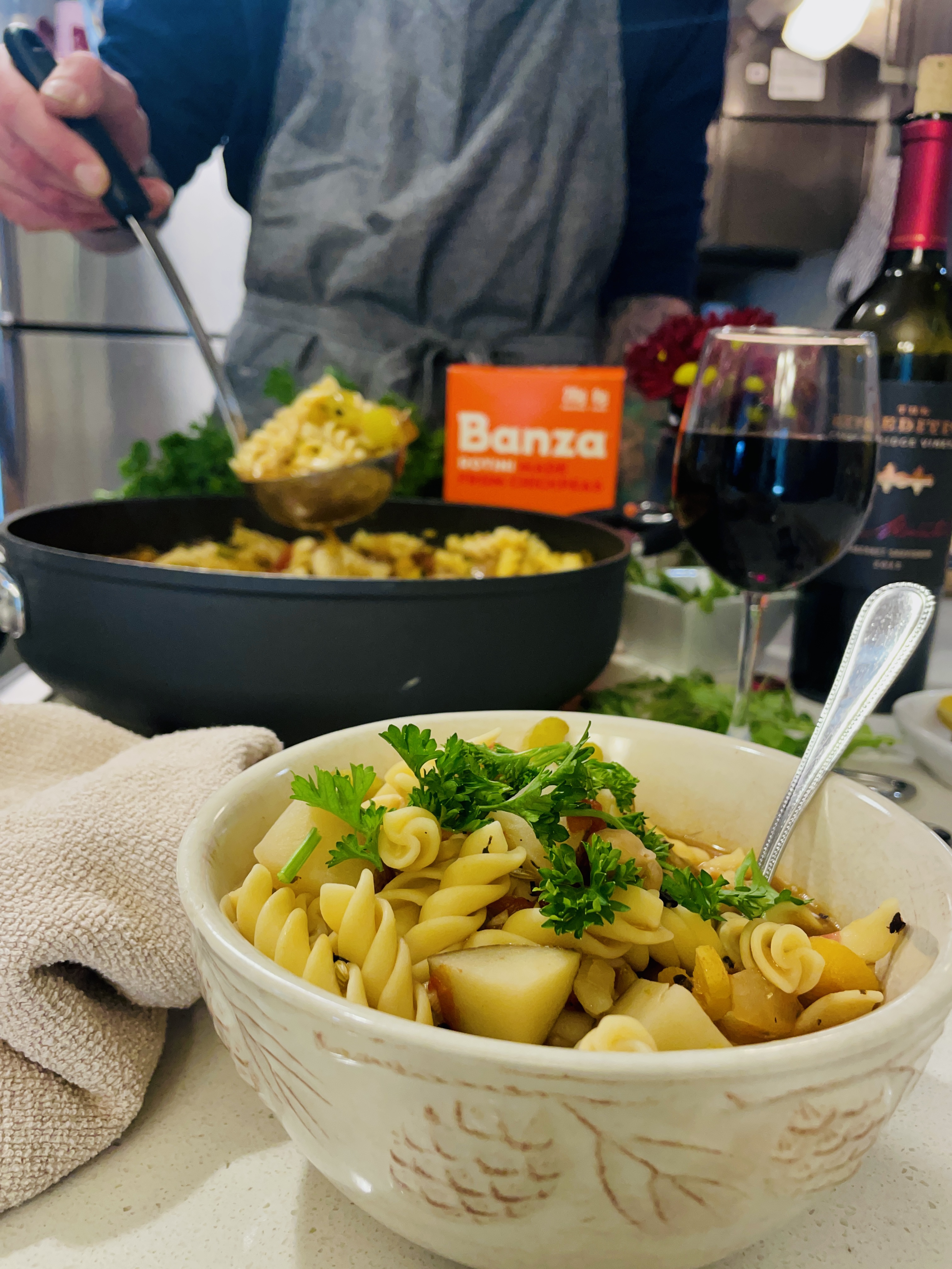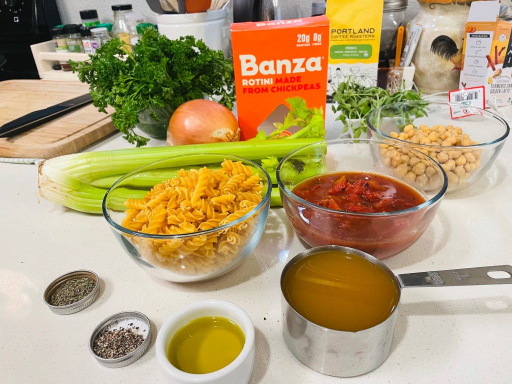 For the veggies, I started off with sautéing minced garlic and half of a yellow onion, then added in chopped carrots, celery, potatoes, and chickpeas. Minestrone is usually made with rice or pasta, so I went for a gluten-free Rotini style pasta from the brand called Banza that is not only one of the best gluten-free pastas on the market, they make their pasta options with chickpeas and a few other very simple ingredients.