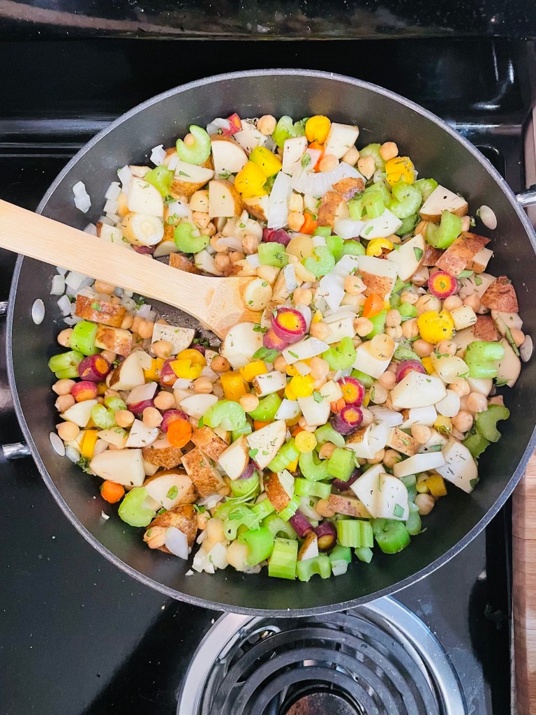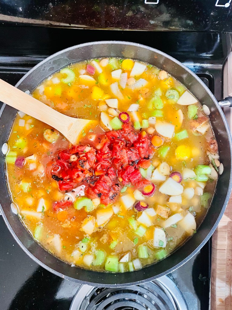 Next, prepare and chop your carrots, celery, potatoes, and fresh oregano, then add them into the pot followed by the chickpeas, fire roasted tomatoes, veggie broth, dried thyme, and fennel seeds.