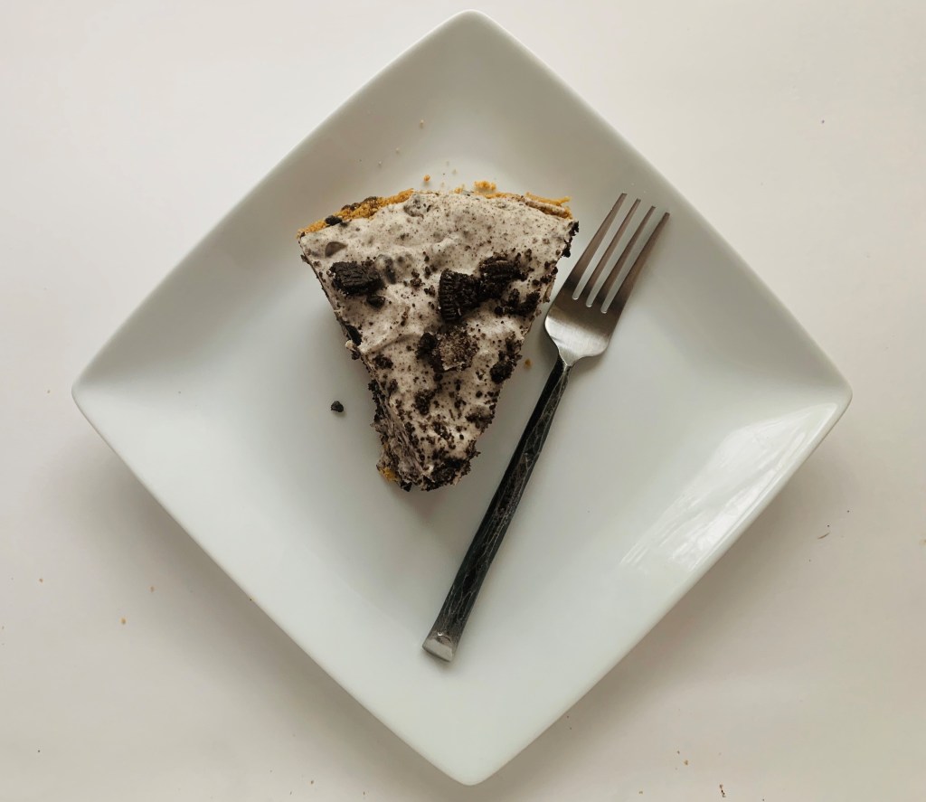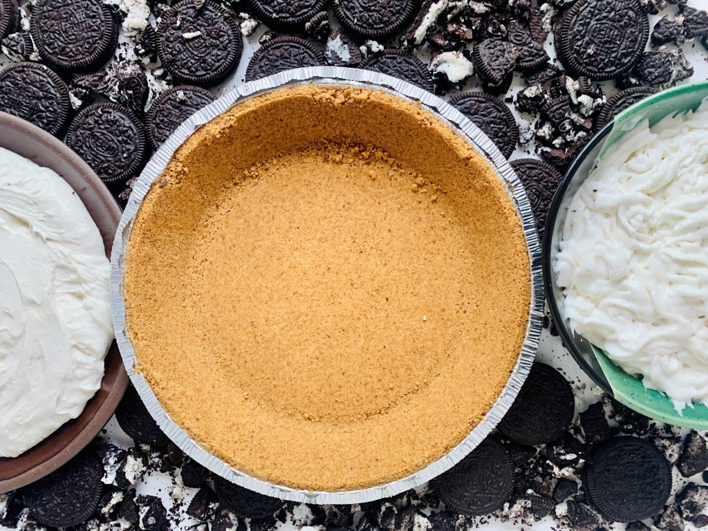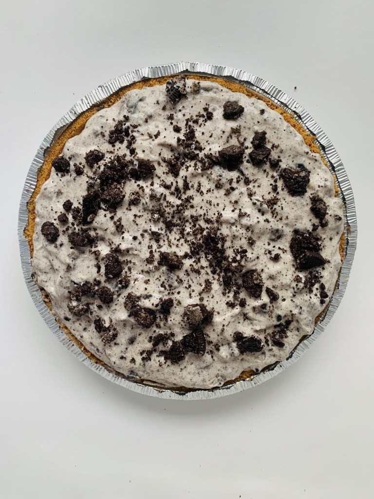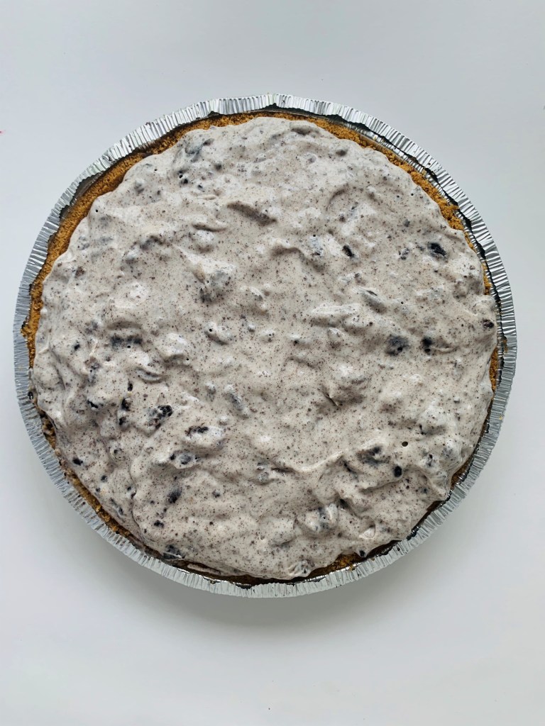 Fold the mixture into the pie crust, sprinkle on some more oreos, and allow it to freeze for at least 1 hour.