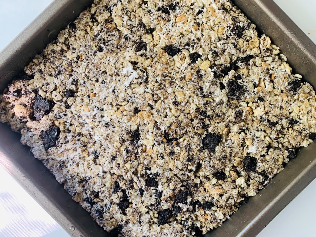 In a large bowl, toss in the crushed oreos, rice krispies, and melted marshmallows and give it a super good stir.