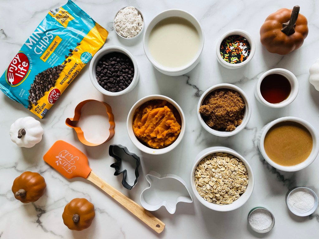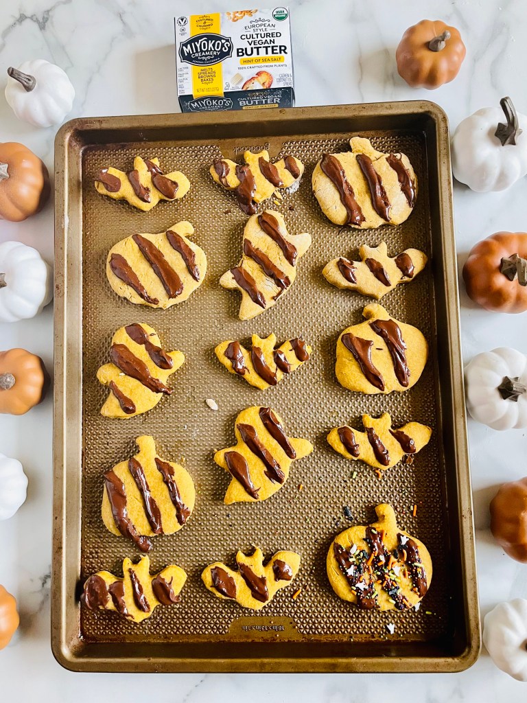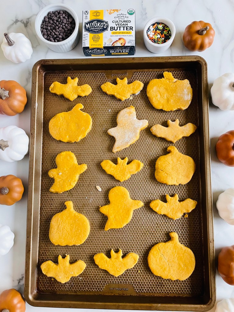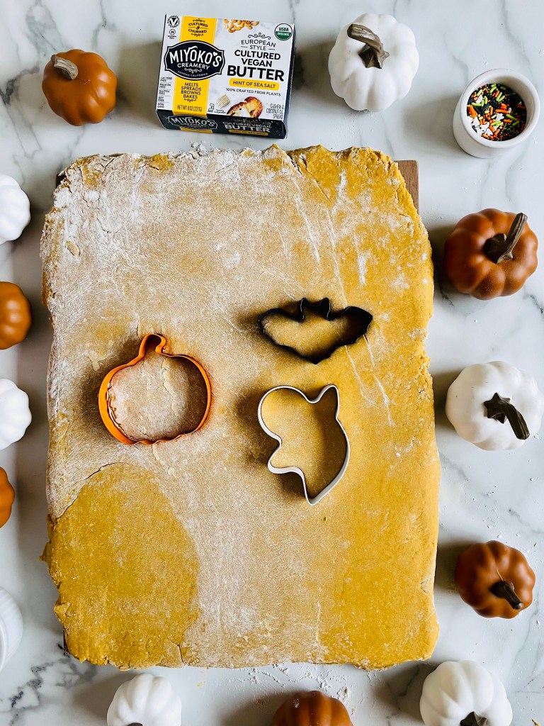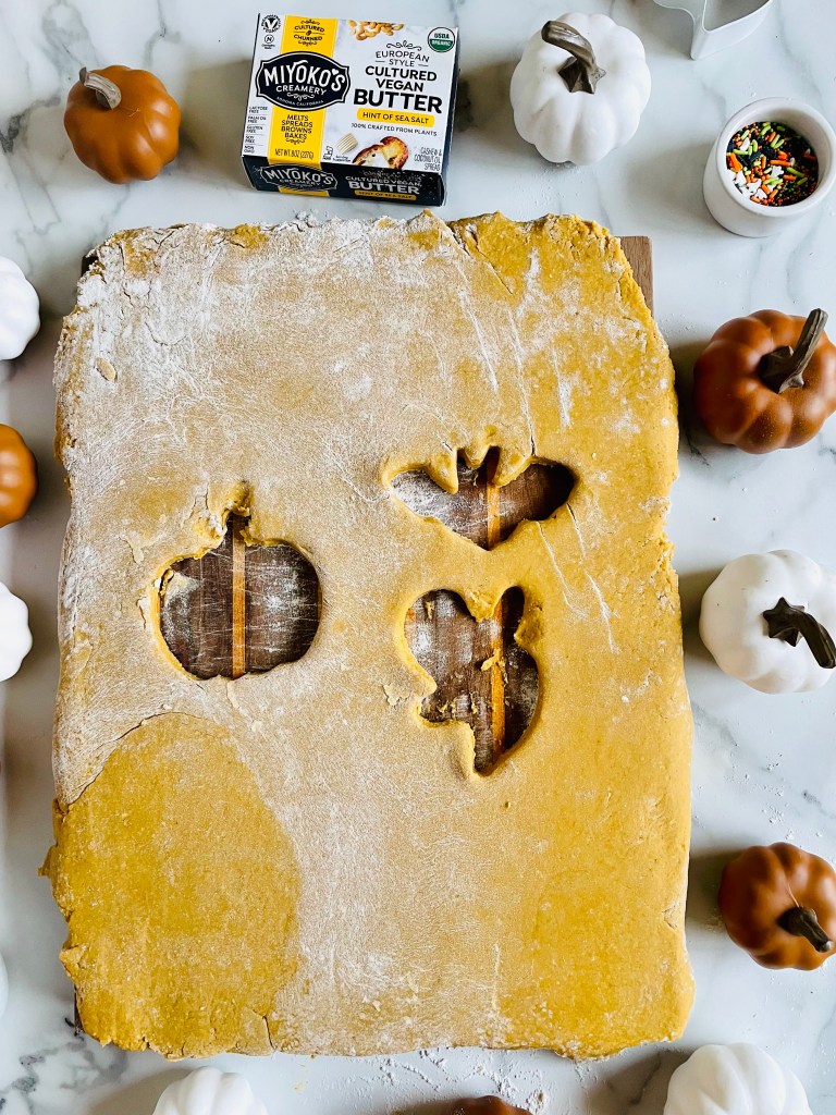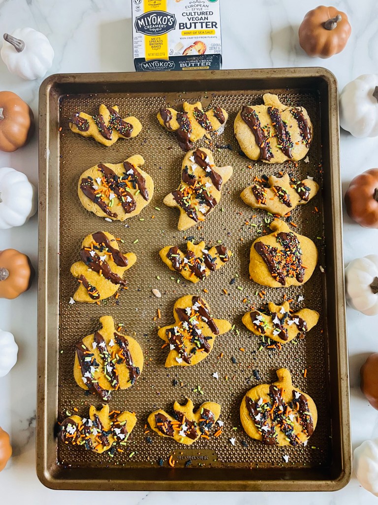 After preparing the oat flour, I stirred it in with light brown sugar, egg replacer from Bob’s Red Mill, baking powder and salt, then added in creamy peanut butter, pumpkin puree, cultured vegan butter, maple syrup, and oat milk to be mixed into a soft dough. The next thing I did was sprinkle down a bit of flour on a flat surface and roll out the dough until it’s about half an inch thick, then shaped the cookies using some spooky cookie cutters I got from Target and baked them at 350 degrees for 20-25 minutes.