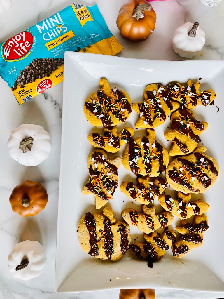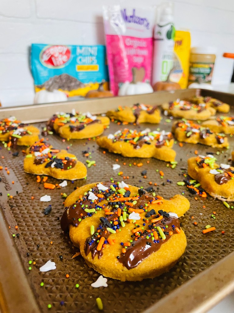 Celebrate the spooky season with these peanut butter pumpkin cookies drizzled with dairy-free chocolate and dashed with spooky sprinkles. With Halloween just around the corner, they made for the perfect treat and would be super awesome for a health conscious party platter.